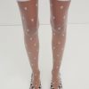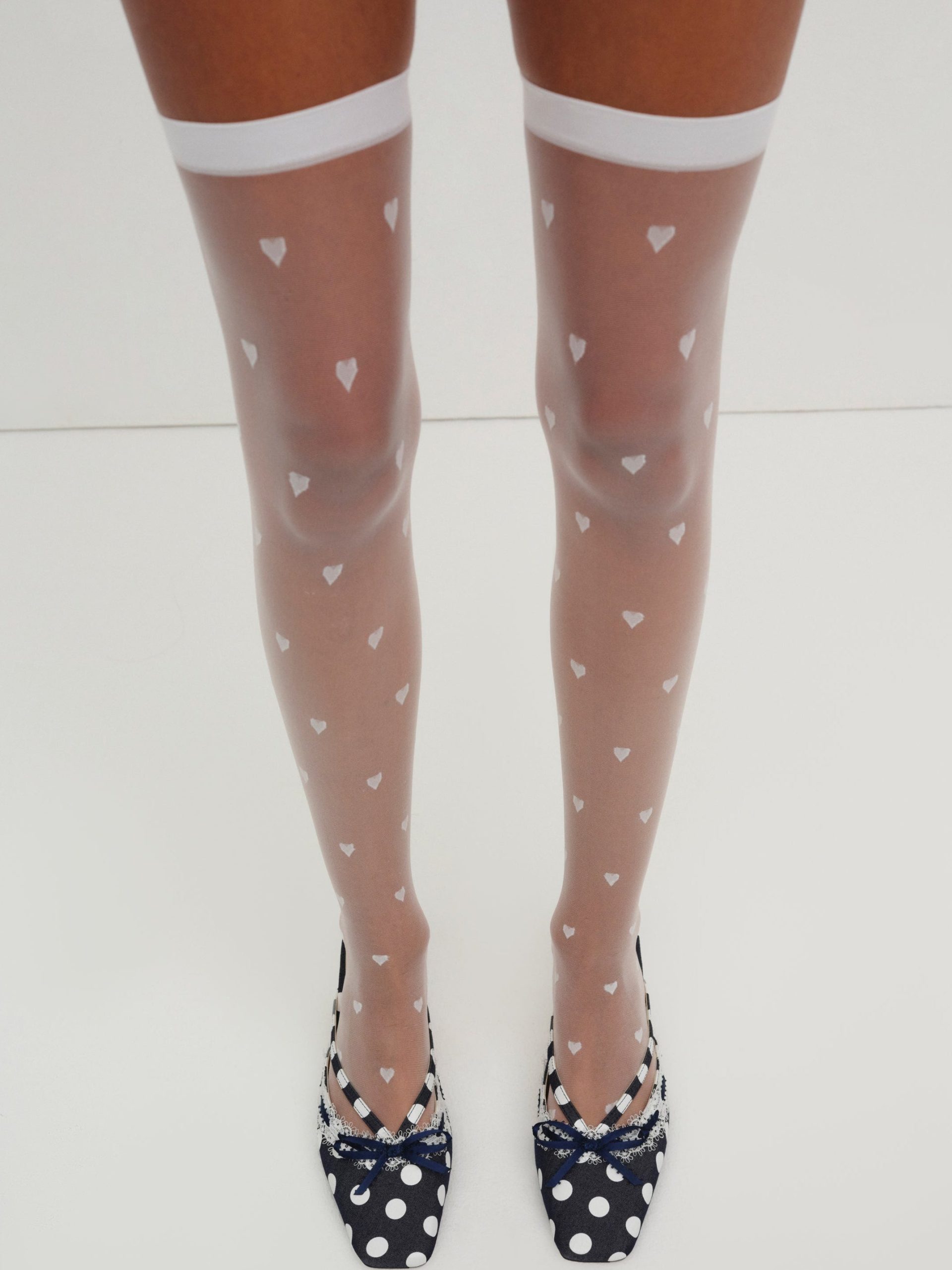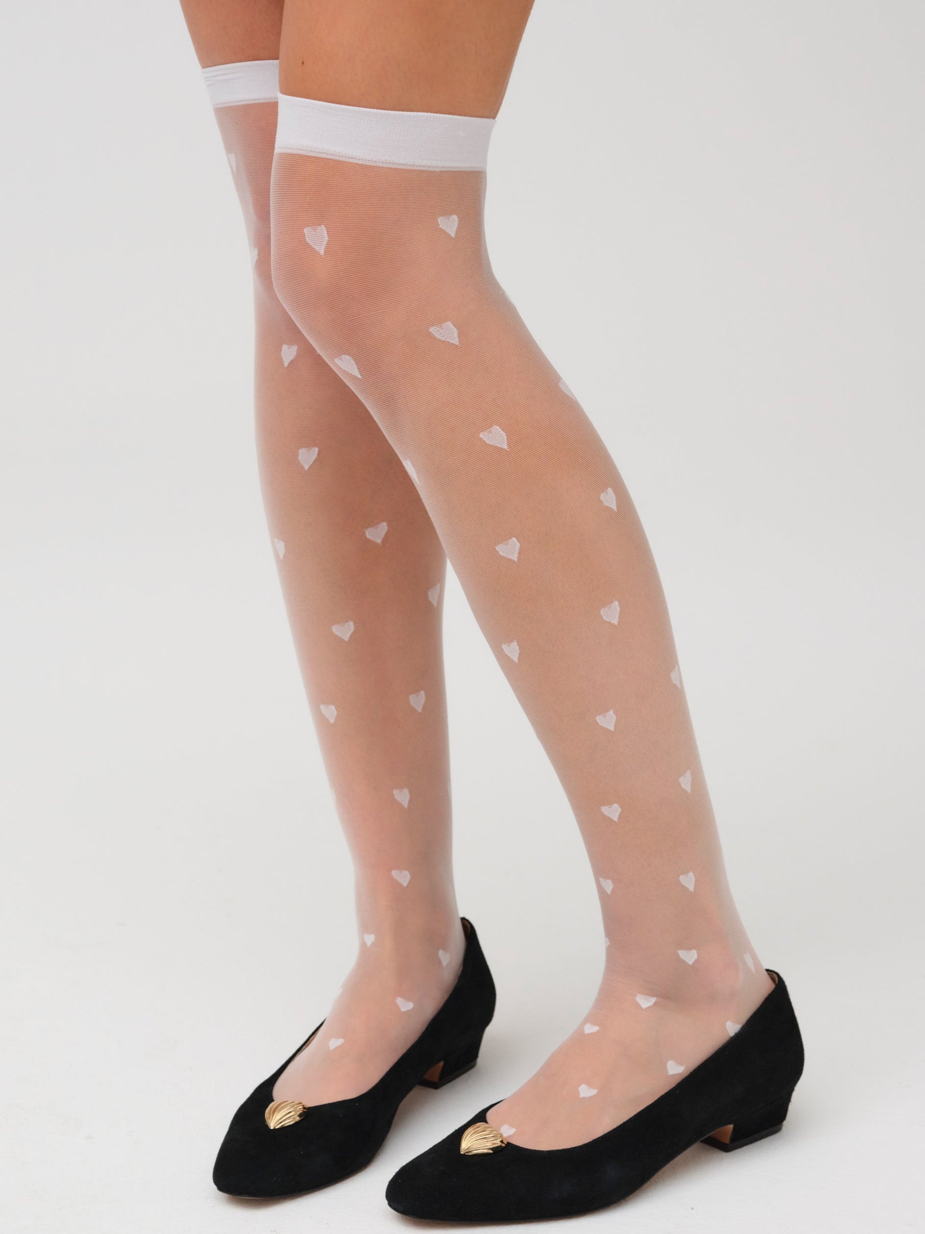 Designed for lovers with a romantic aesthetic, these knee high heart mesh socks are crafted in a sheer nylon silk and adorned with white hearts throughout.