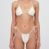 The sweetest string bikini bottom under the sun—the Lisbet white thong bikini is designed in a ruffled pointelle material. It features a yellow rosette detail at the center-front plus contrast gingham binding.