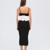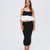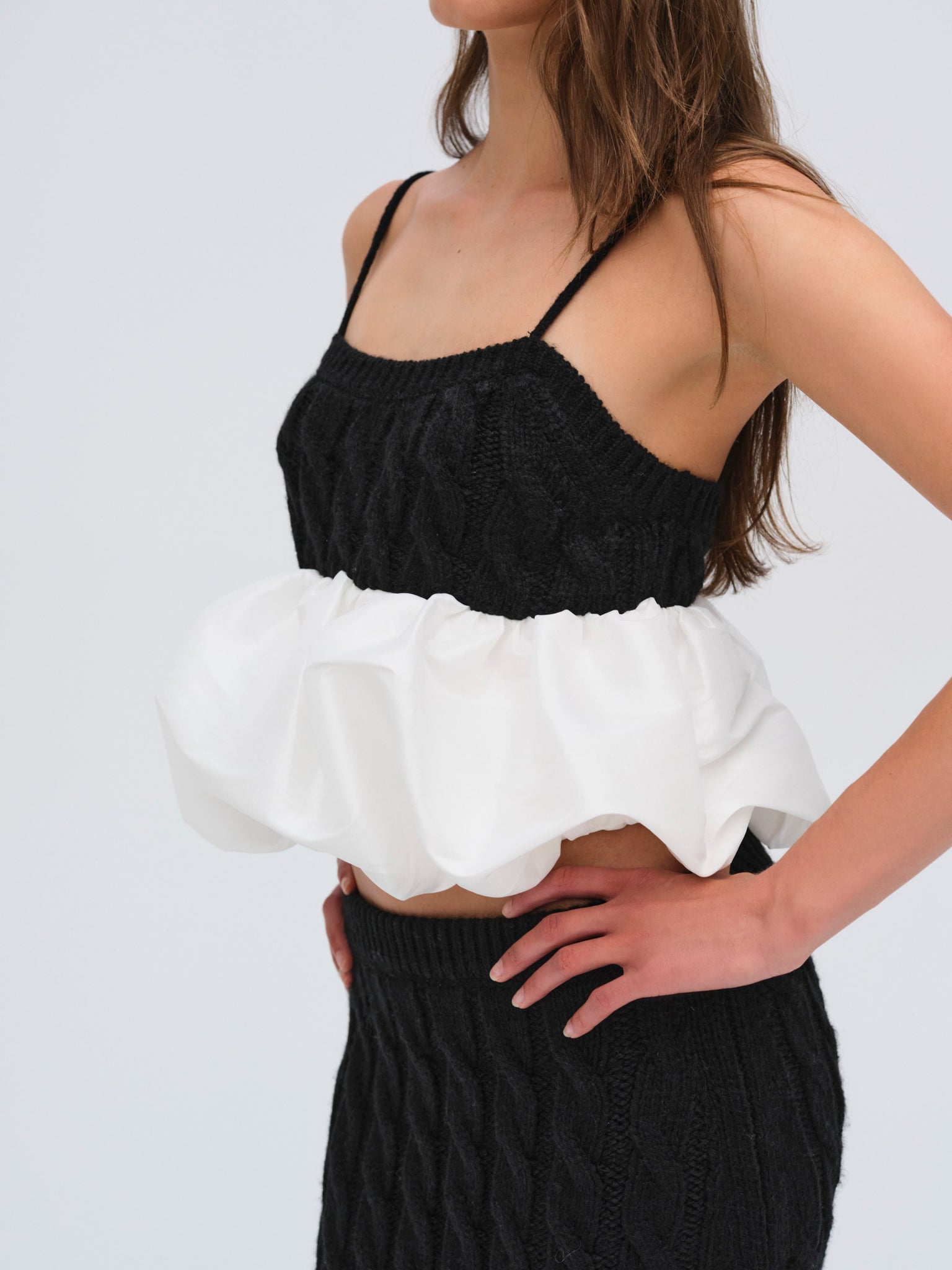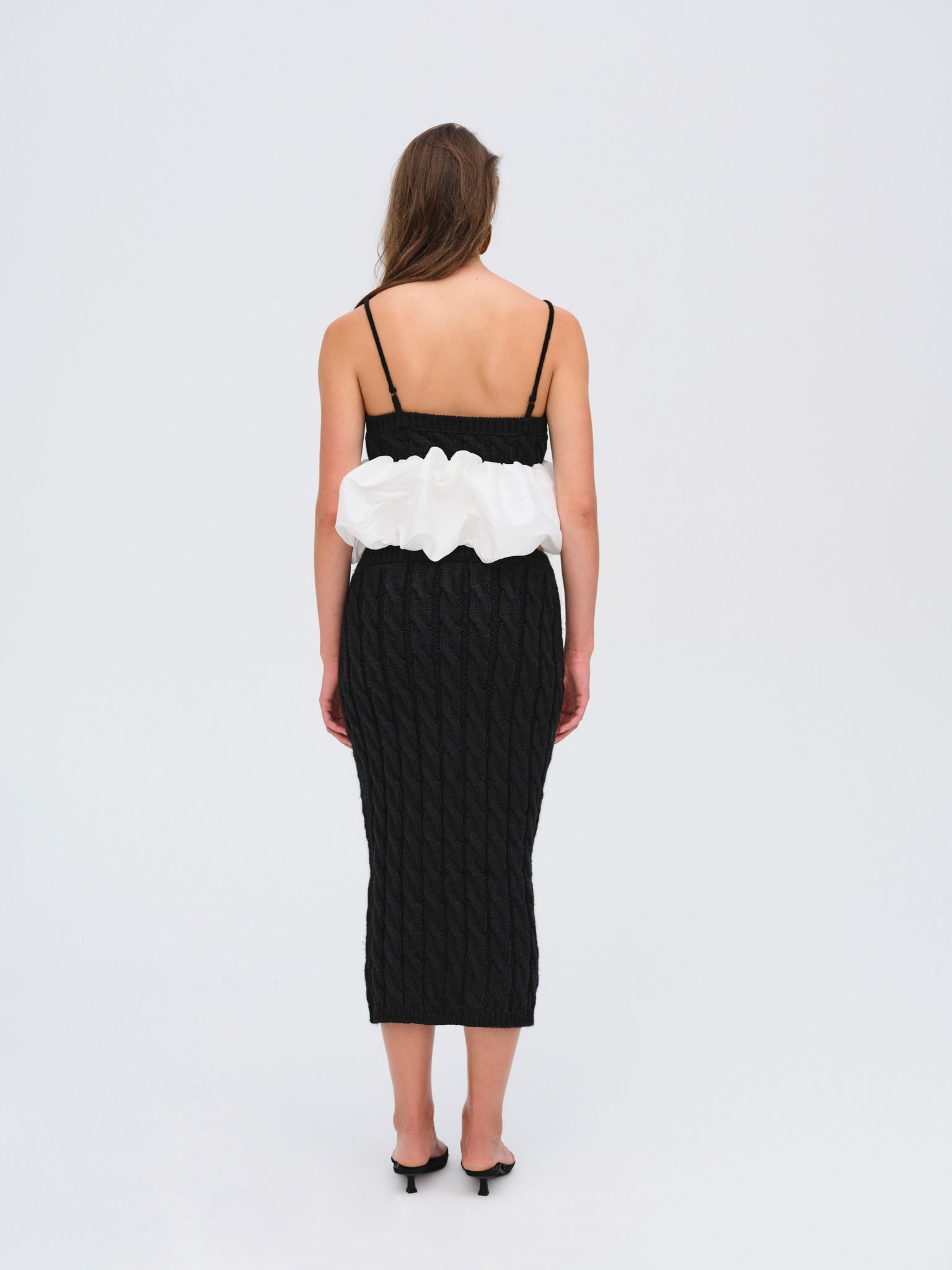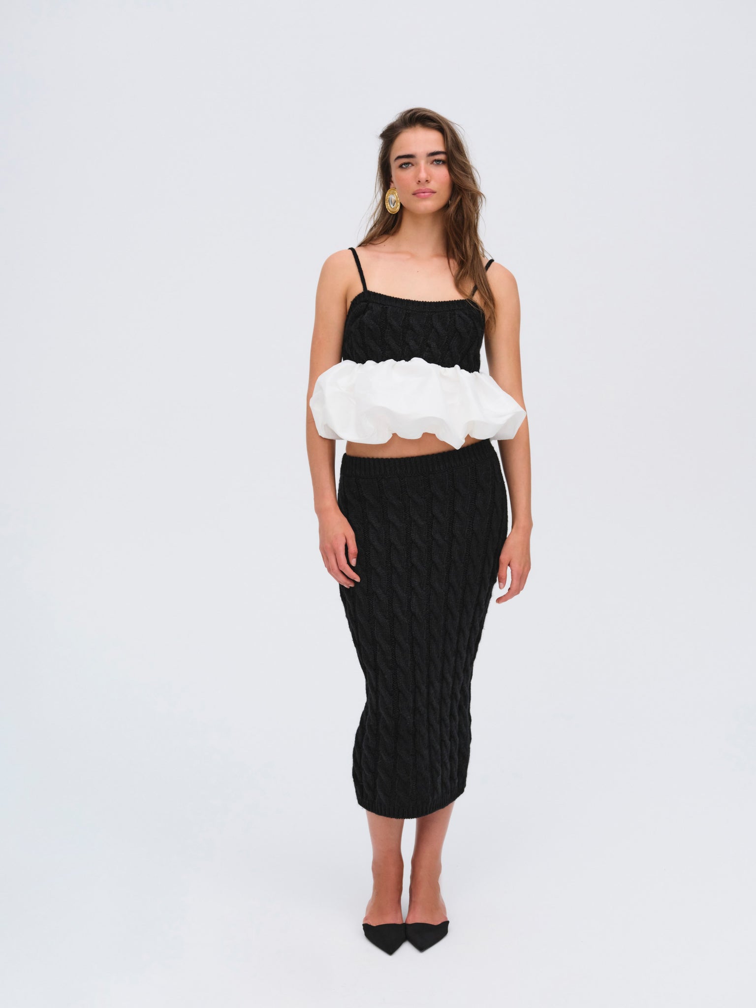 For afternoon tea, come dressed up in the Lise black knit tank top—featuring our silhouette of the season, the Puff. Crafted in a chunky cable knit, this bubble hem top is juxtaposed with a contrast taffeta hem for a look that’s both cozy and elegant. Pair it with the matching Lise Knit Midi Skirt for a co-ord skirt set.