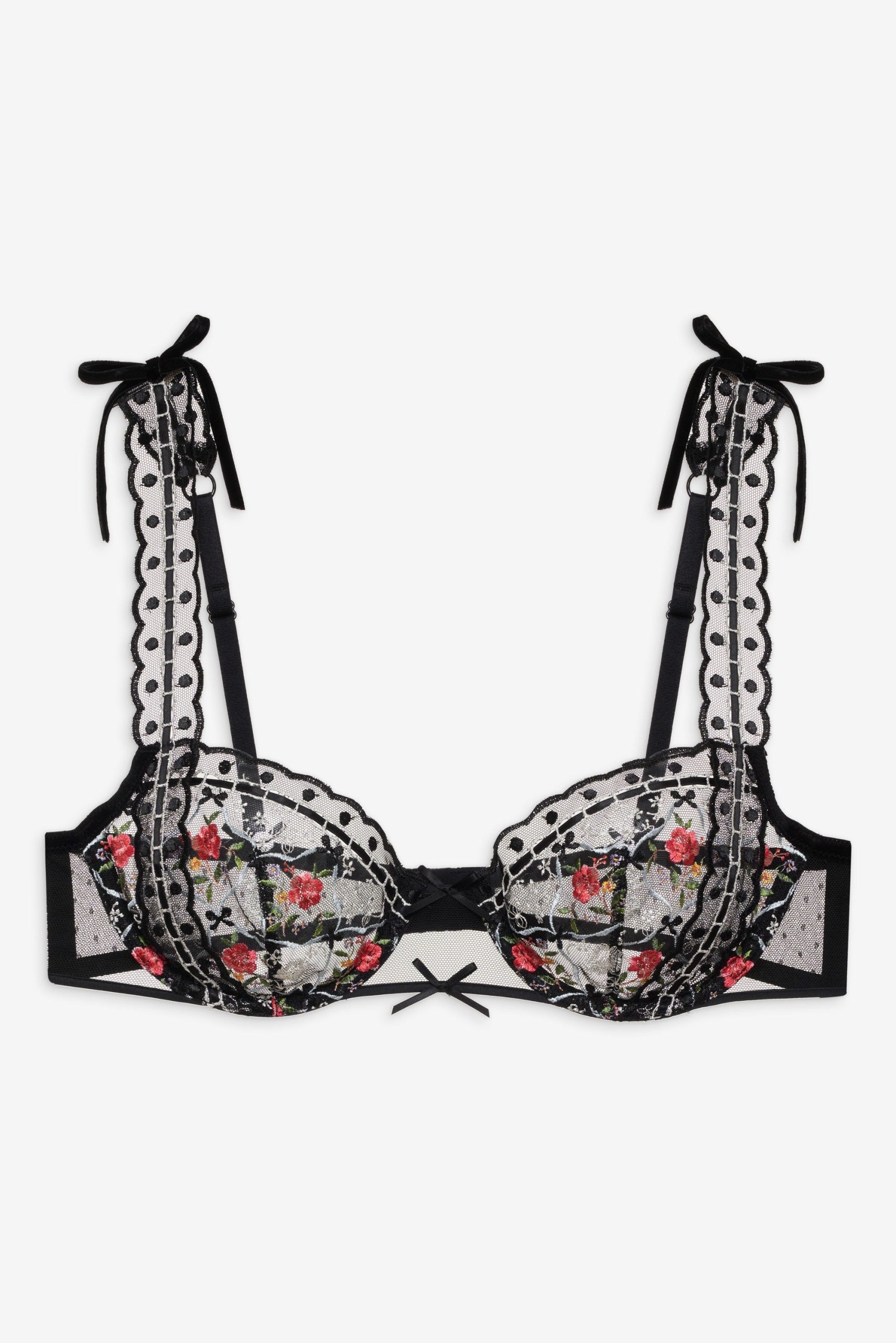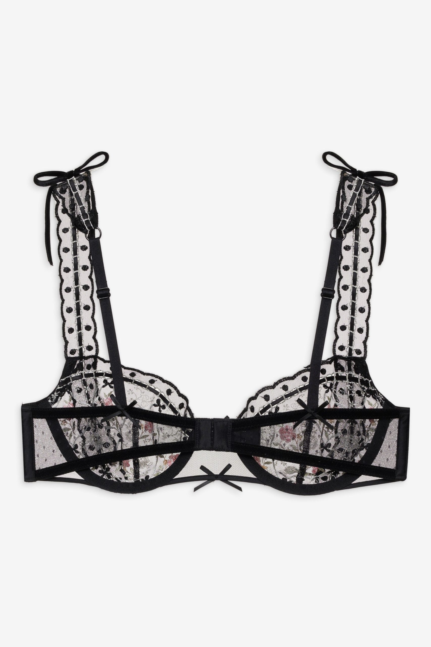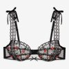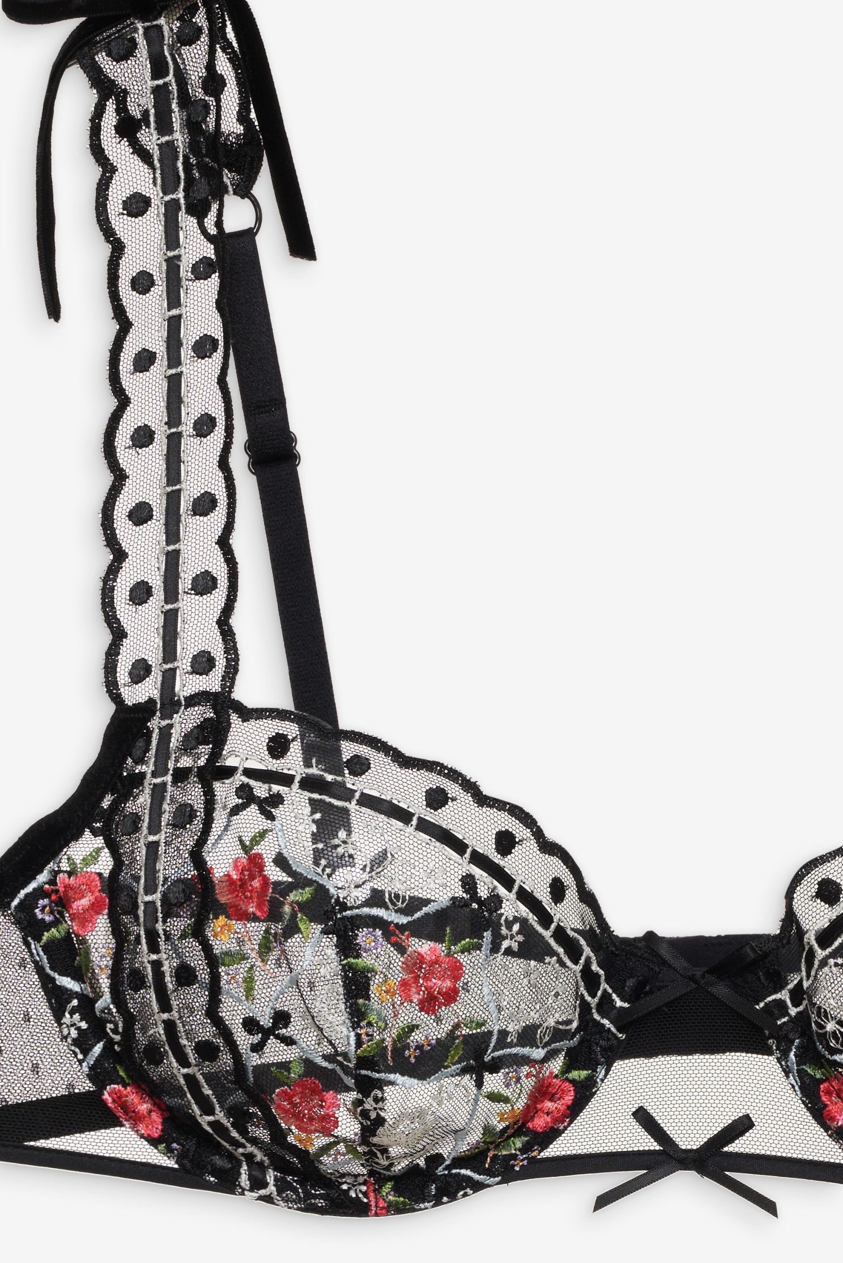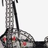 Festive and feminine, the Loretta black underwire bra exudes a timeless elegance that will transcend the holiday season. Featuring delicate floral embroidery, this black bra is decorated with a lace trim, skinny ribbons, and decorative velvet bows at the shoulders. Pair it with the Loretta Thong Panty for a matching set.