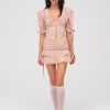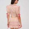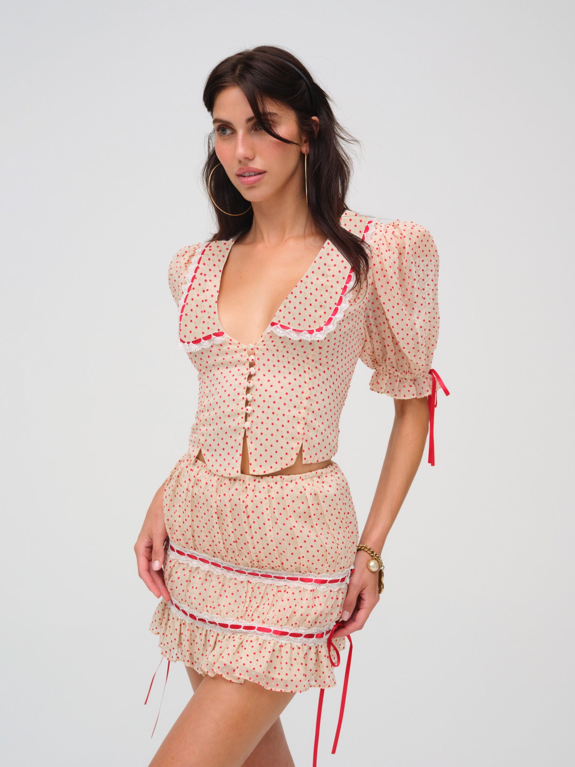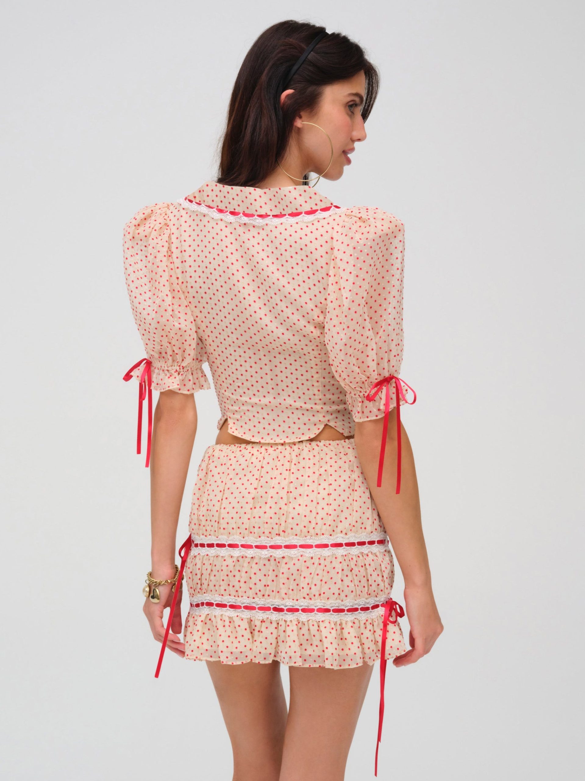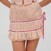 Inspired by nostalgic ‘50s and ‘60s silhouettes, the Love Dot cream mini skirt charms with its vintage-inspired red polka dot print. Adorned with sloped ribbon lace trims throughout, this pull-on style polka dot mini skirt features a ruched fitted body and ruffled hem.