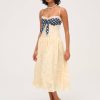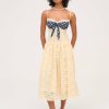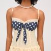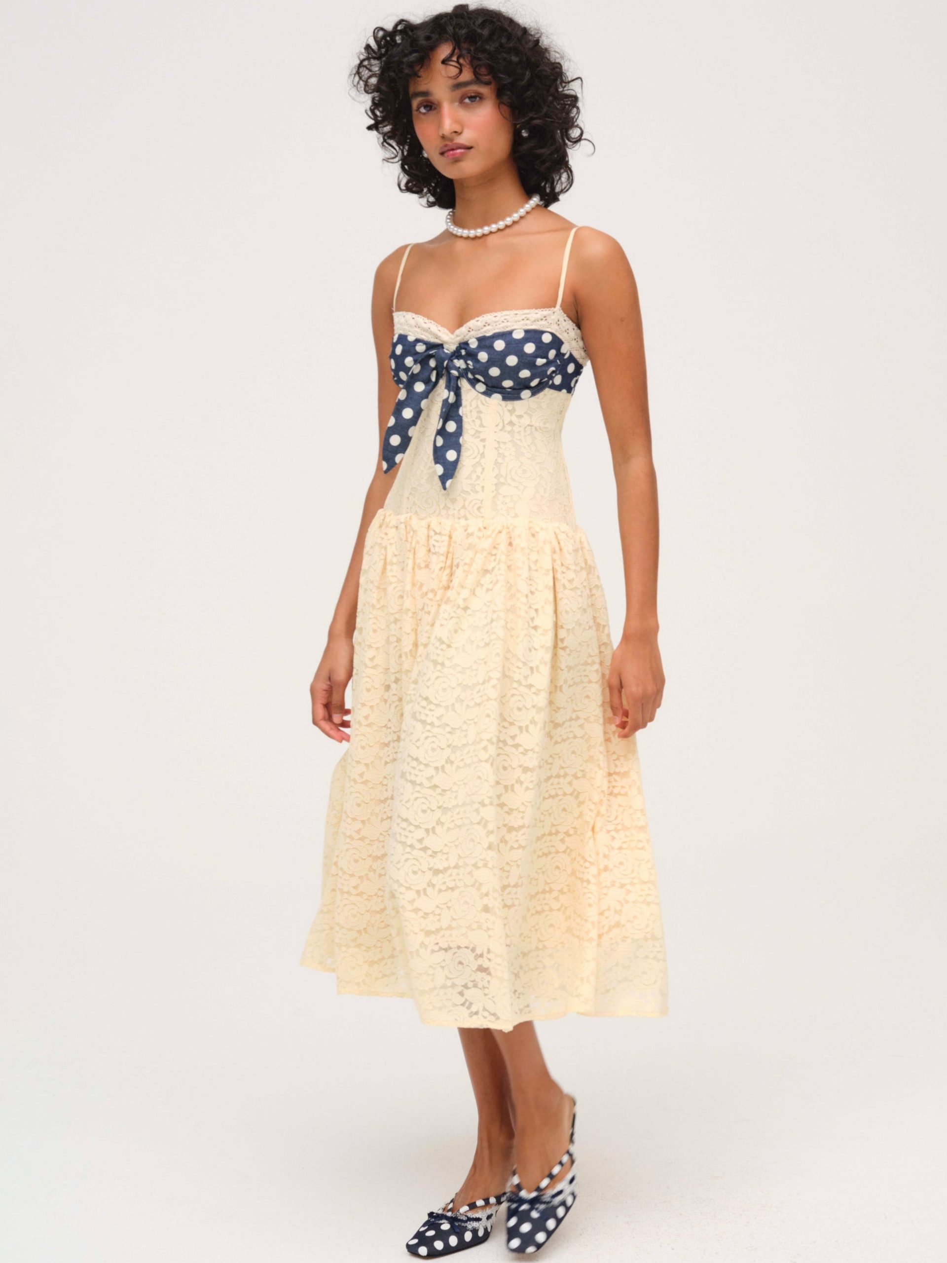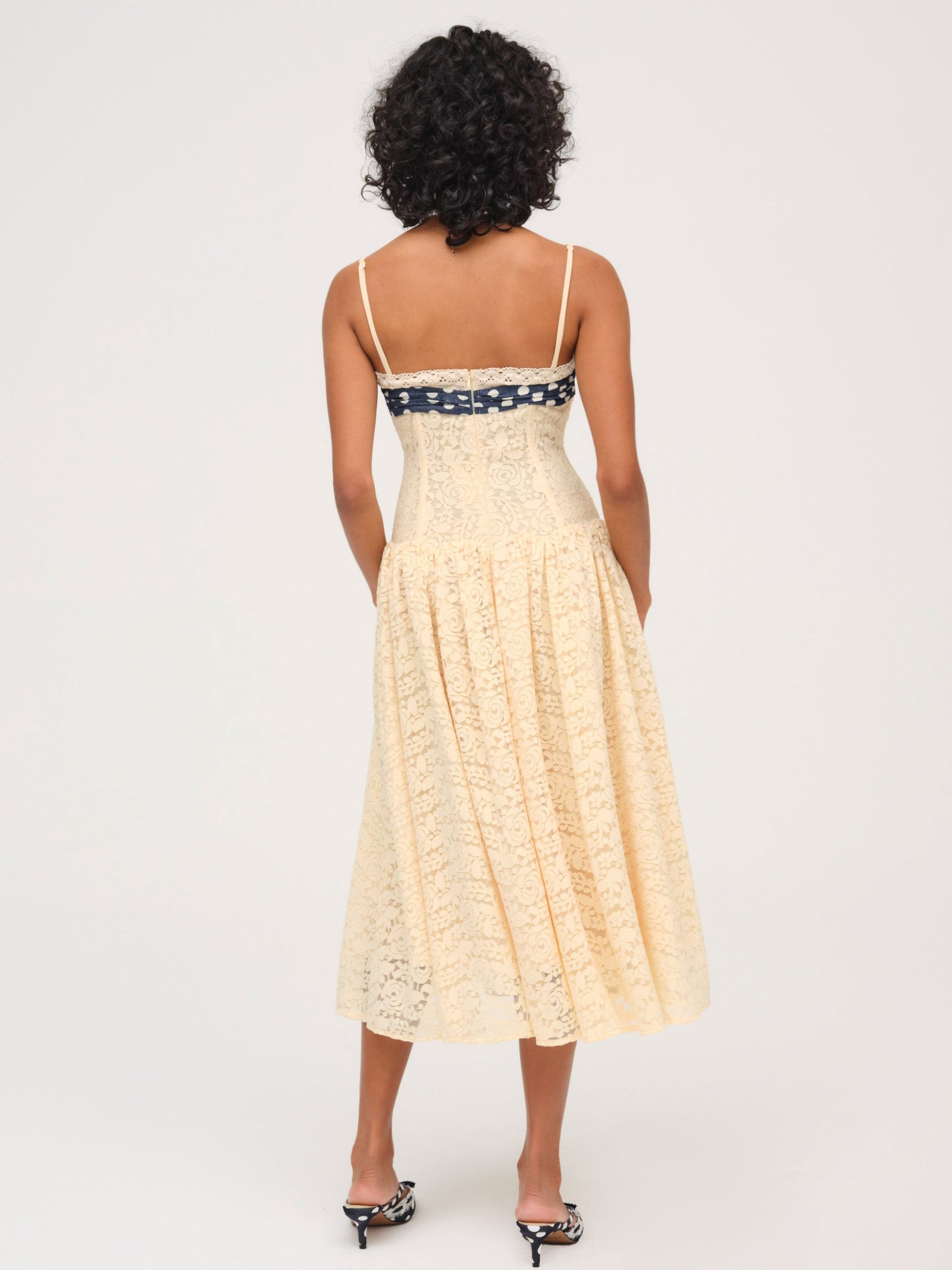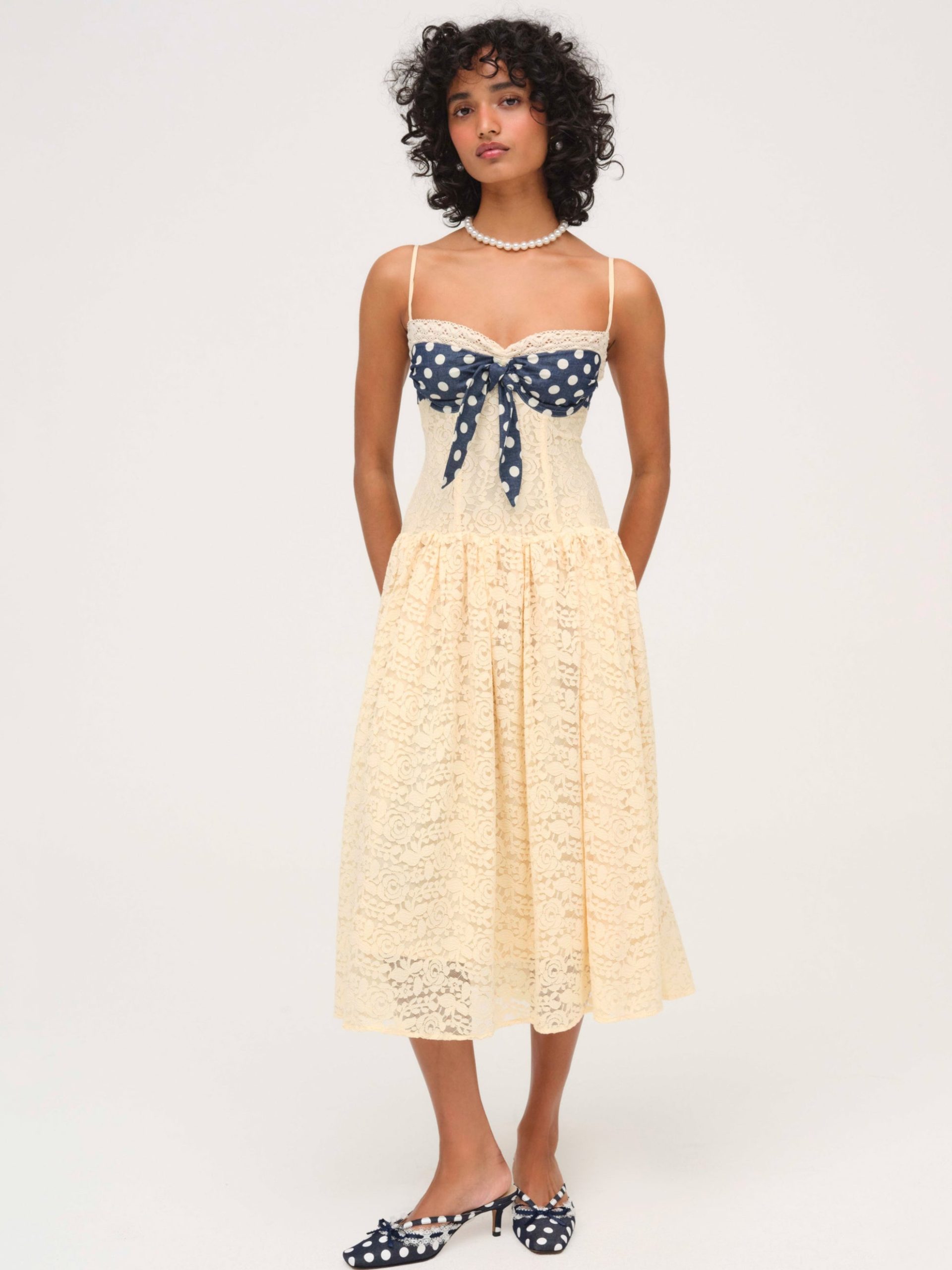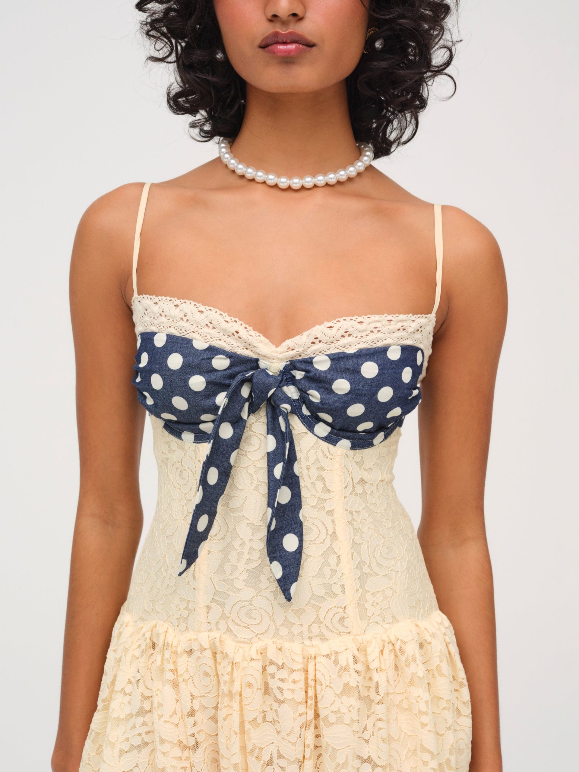 Become the ultimate chic Muse in the Lucy lace midi dress–a vintage-inspired drop waist dress crafted in a delicate floral lace. This buttercream midi dress features underwire cups, boned bodice, a gathered skirt and is adorned with lace trims and a contrast polka dot overlay panel at bust that knots.