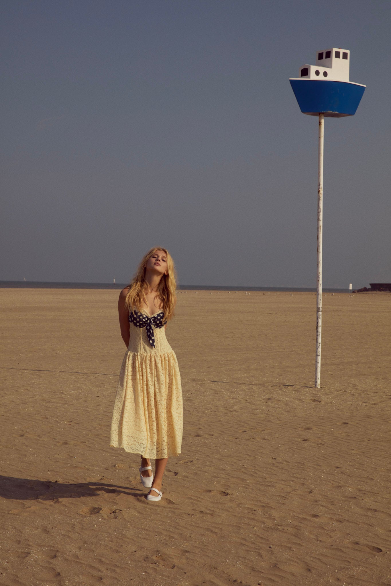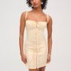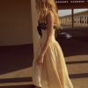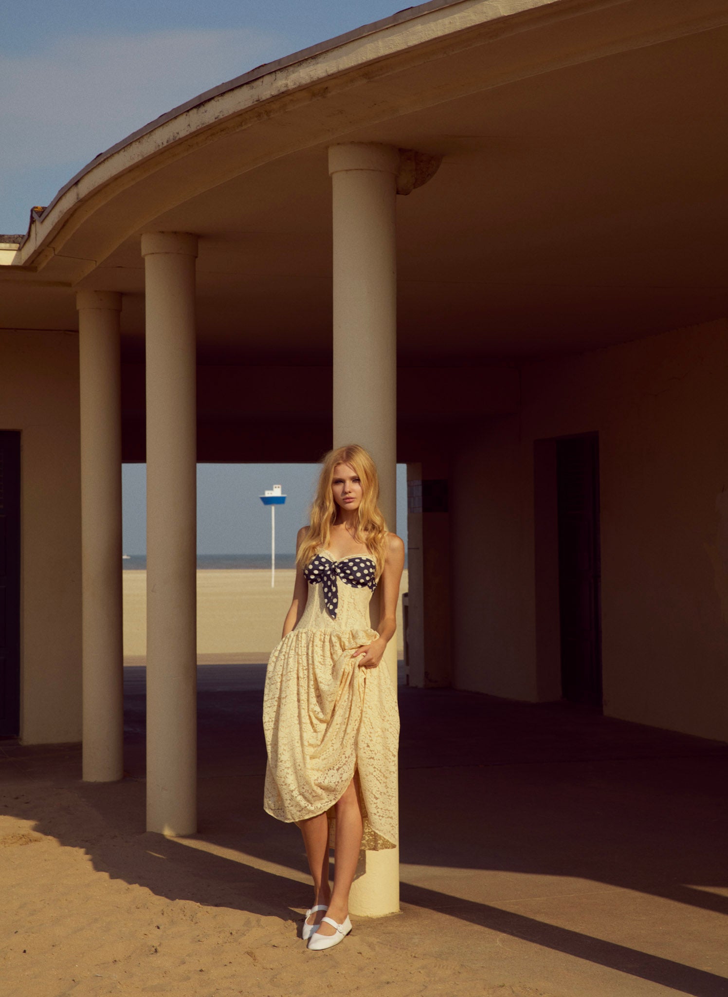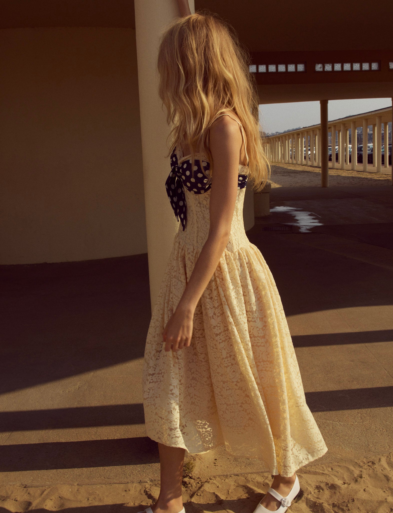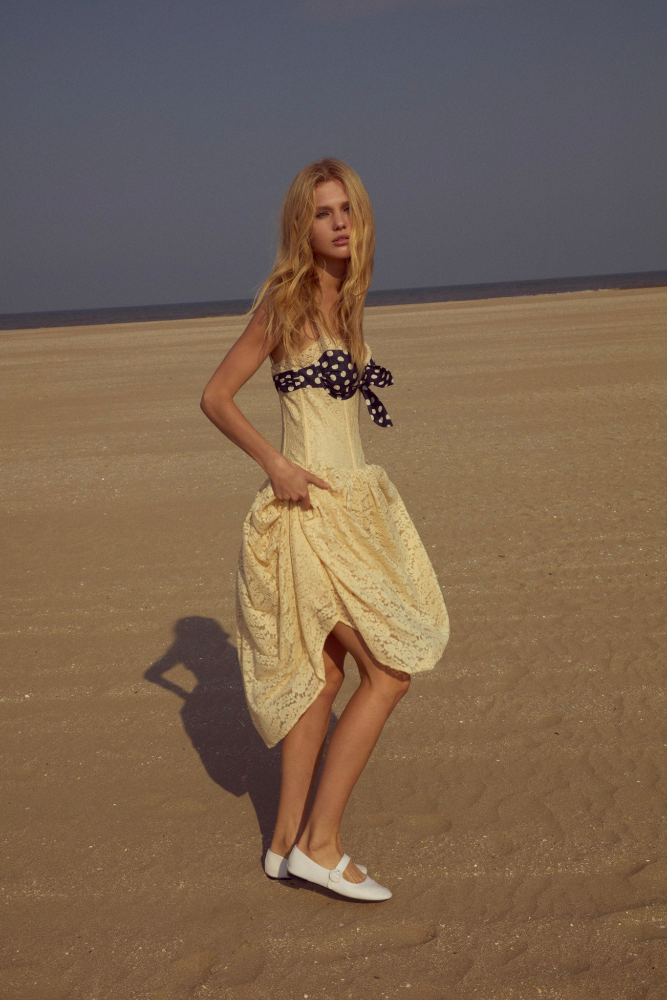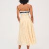 Become the ultimate chic Muse in the Lucy lace midi dress–a vintage-inspired drop waist dress crafted in a delicate floral lace. This buttercream midi dress features underwire cups, boned bodice, a gathered skirt and is adorned with lace trims and a contrast polka dot overlay panel at bust that knots.