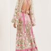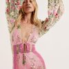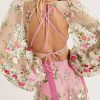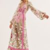 Spring garden engineered embroidery tulle maxi dress. Deep V neckline, billowy long sleeves, and lace trim throughout. Built-in bra and panty lining.