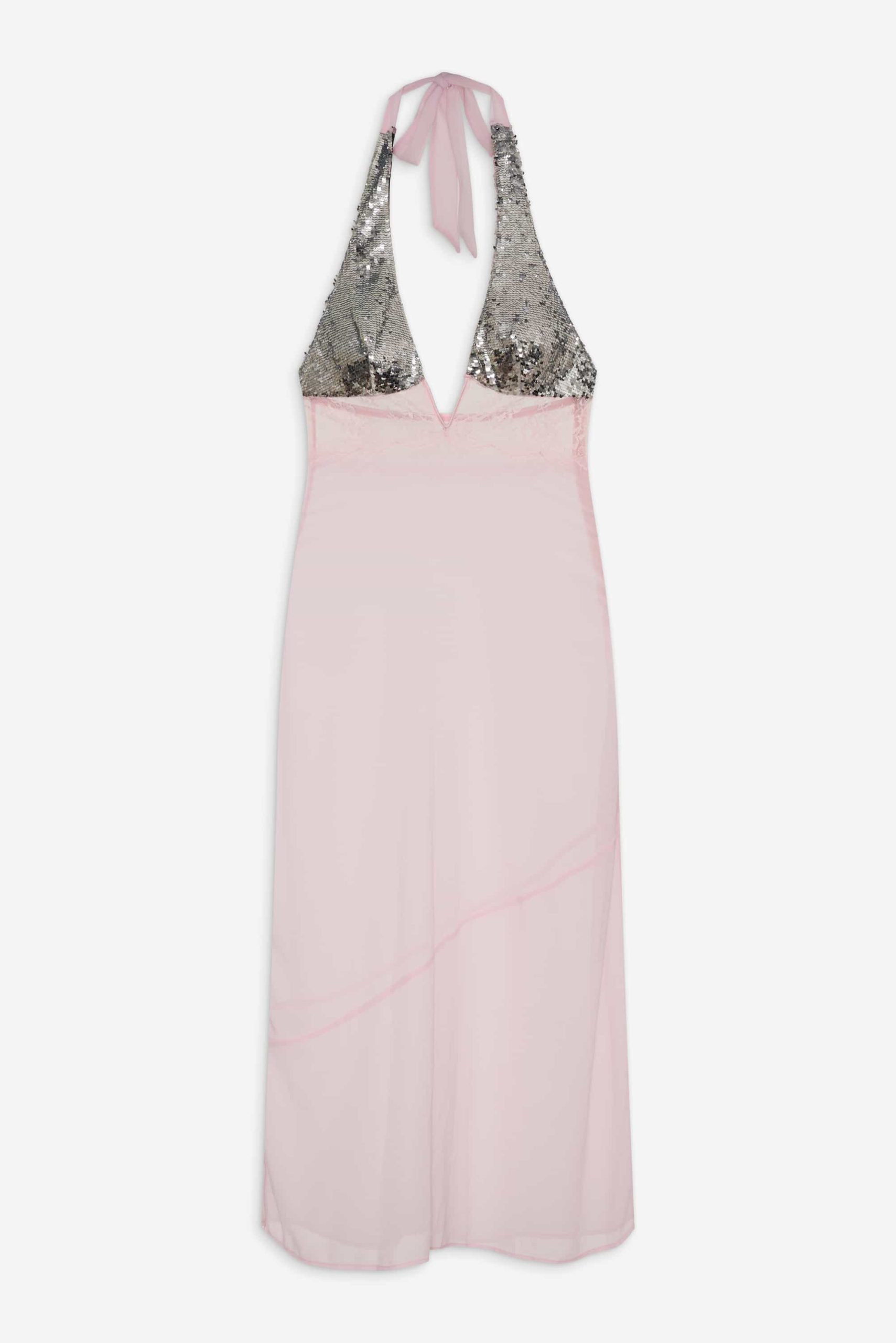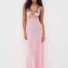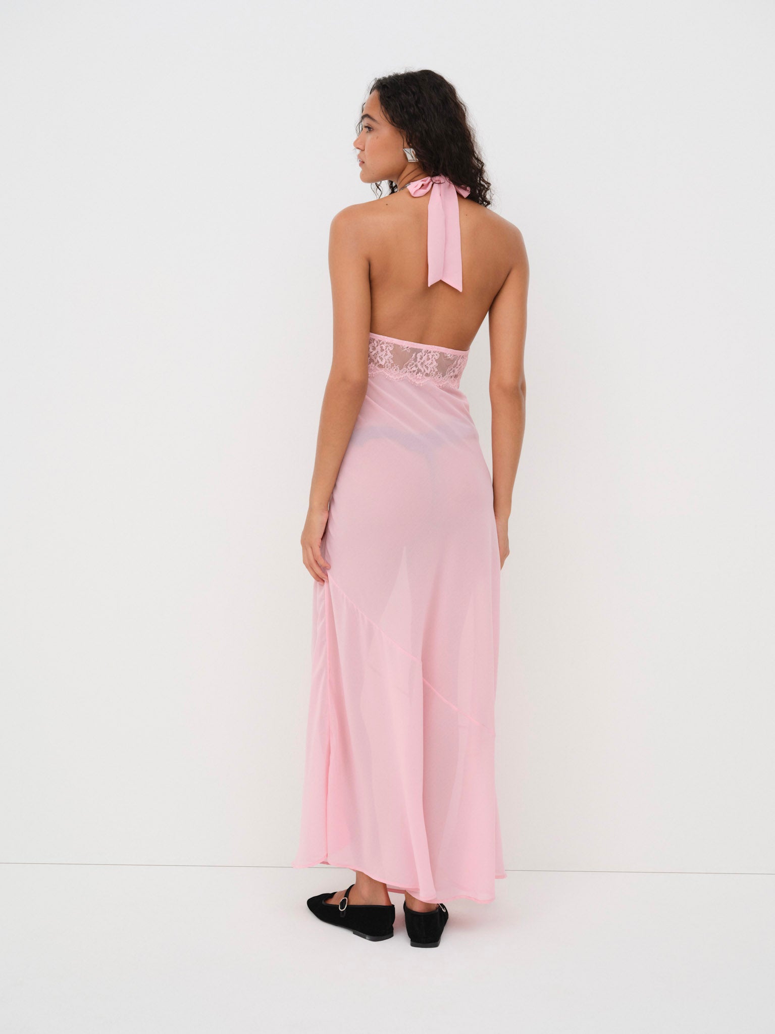 Take the spotlight this season in the mesmerizing Maia pink slip dress—a sheer maxi dress crafted in chiffon with a plunging V neckline, shimmering sequins at the cups, and a lace trim at the under-bust.