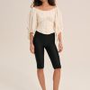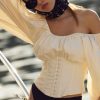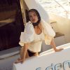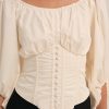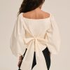 Dress for the Riviera with the Marion puff sleeve blouse–a bustier top with a boned bodice, gathered bust, and elasticized 3/4 length sleeves. This cotton top features a wide neckline and an oversized functional bow at back for a feminine touch.