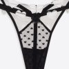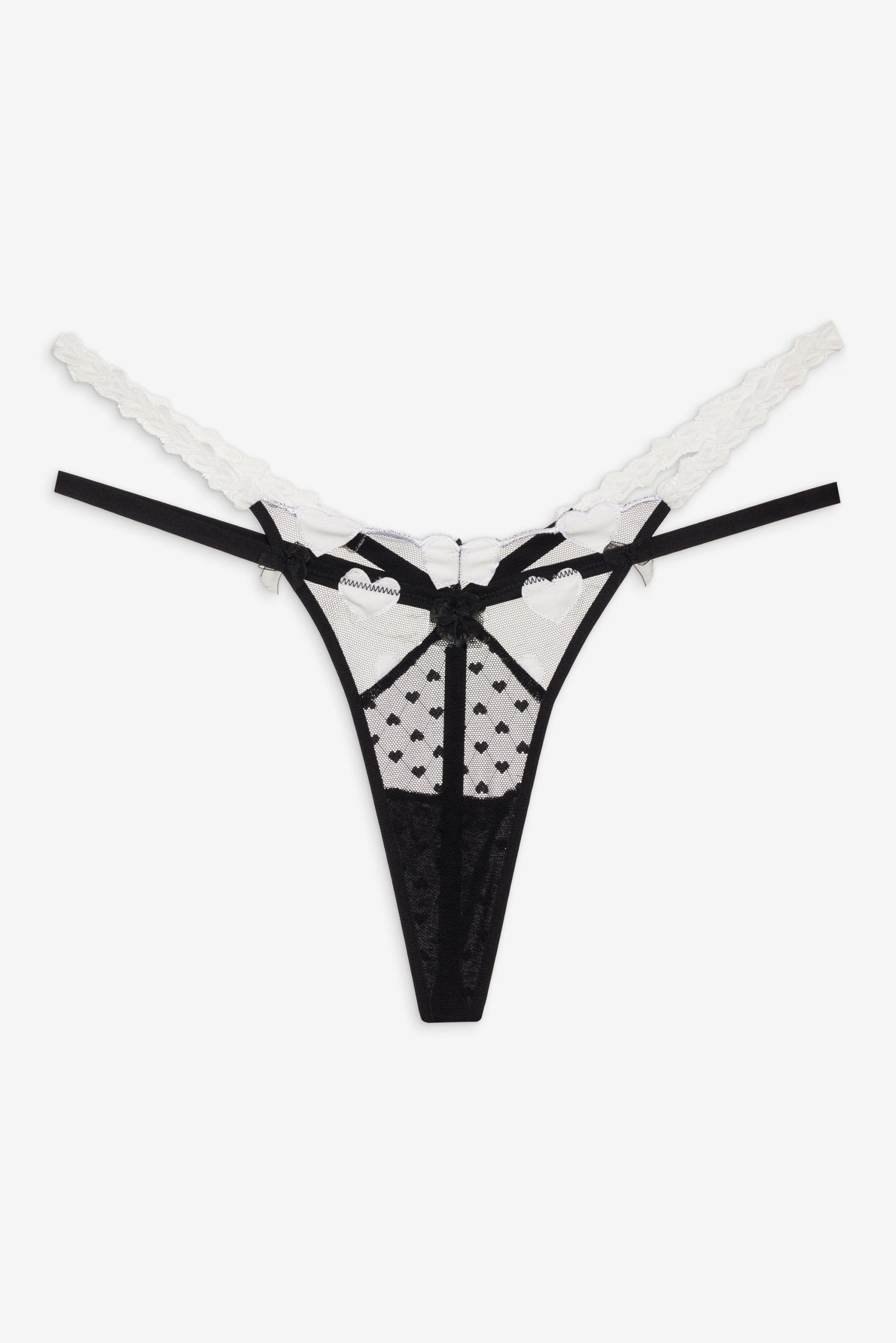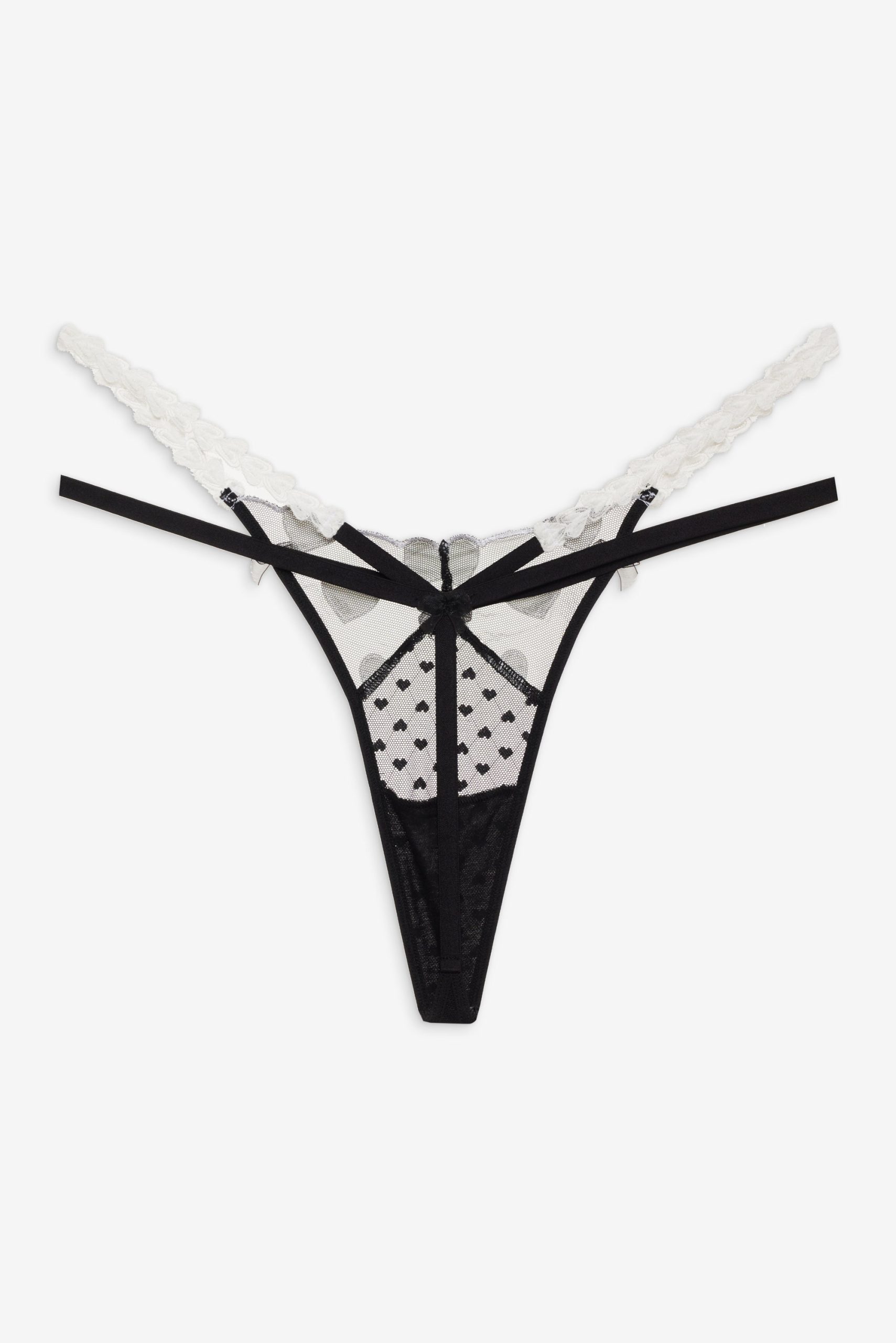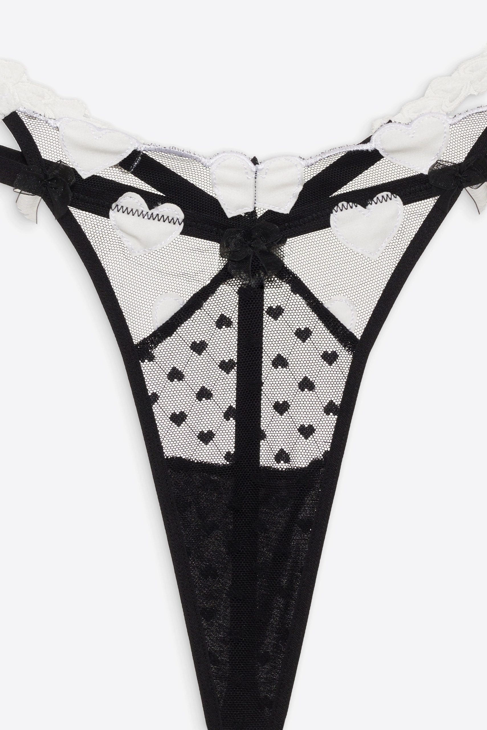 Write your own love story in the Mia black thong—a sexy g string adorned with heart appliqués, an embroidered heart trim, and organza bows. Pair it with the Mia Underwire Bra and Mia Garter Belt for a matching 3 piece set.