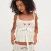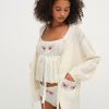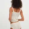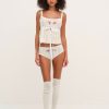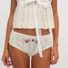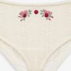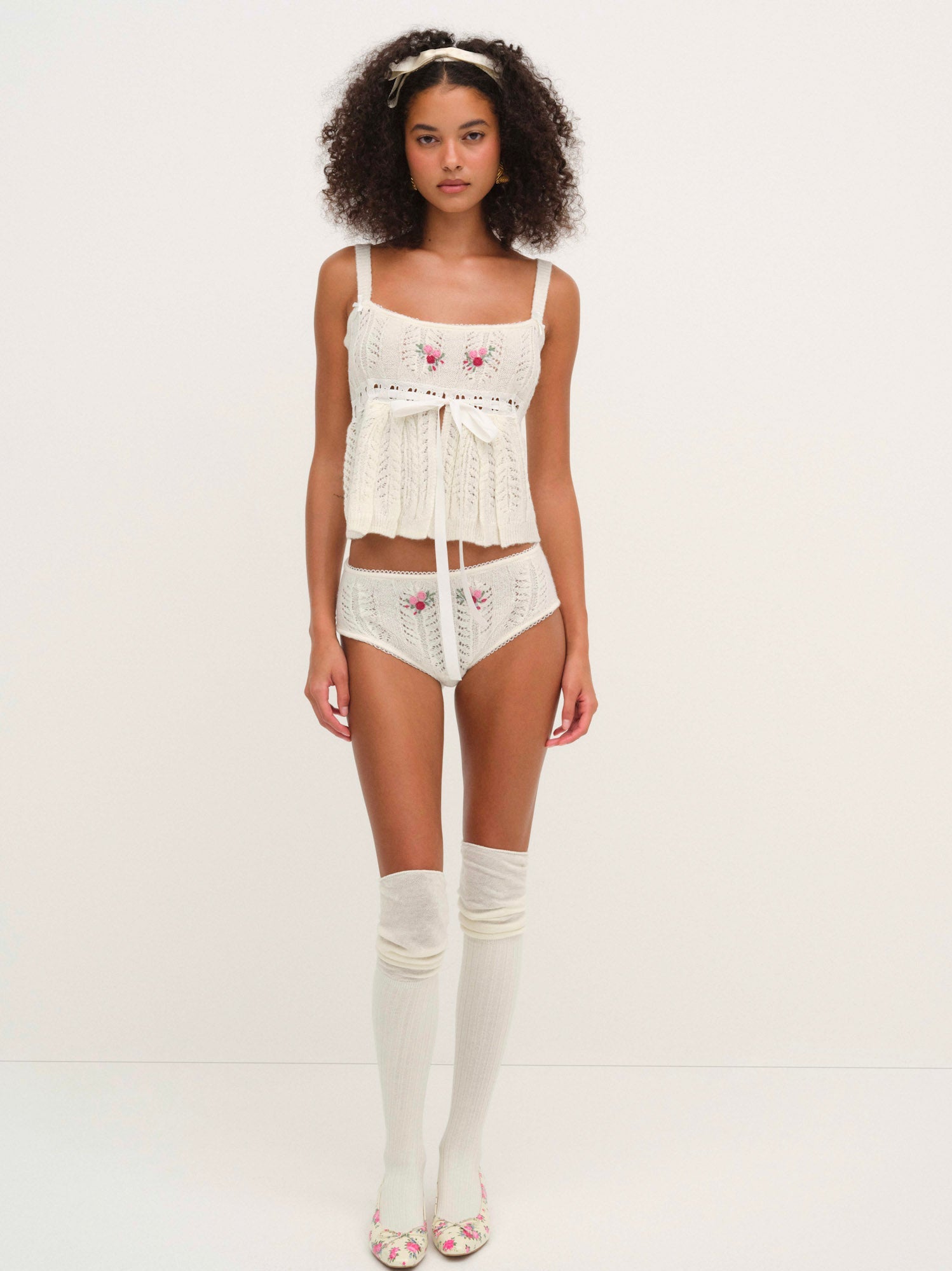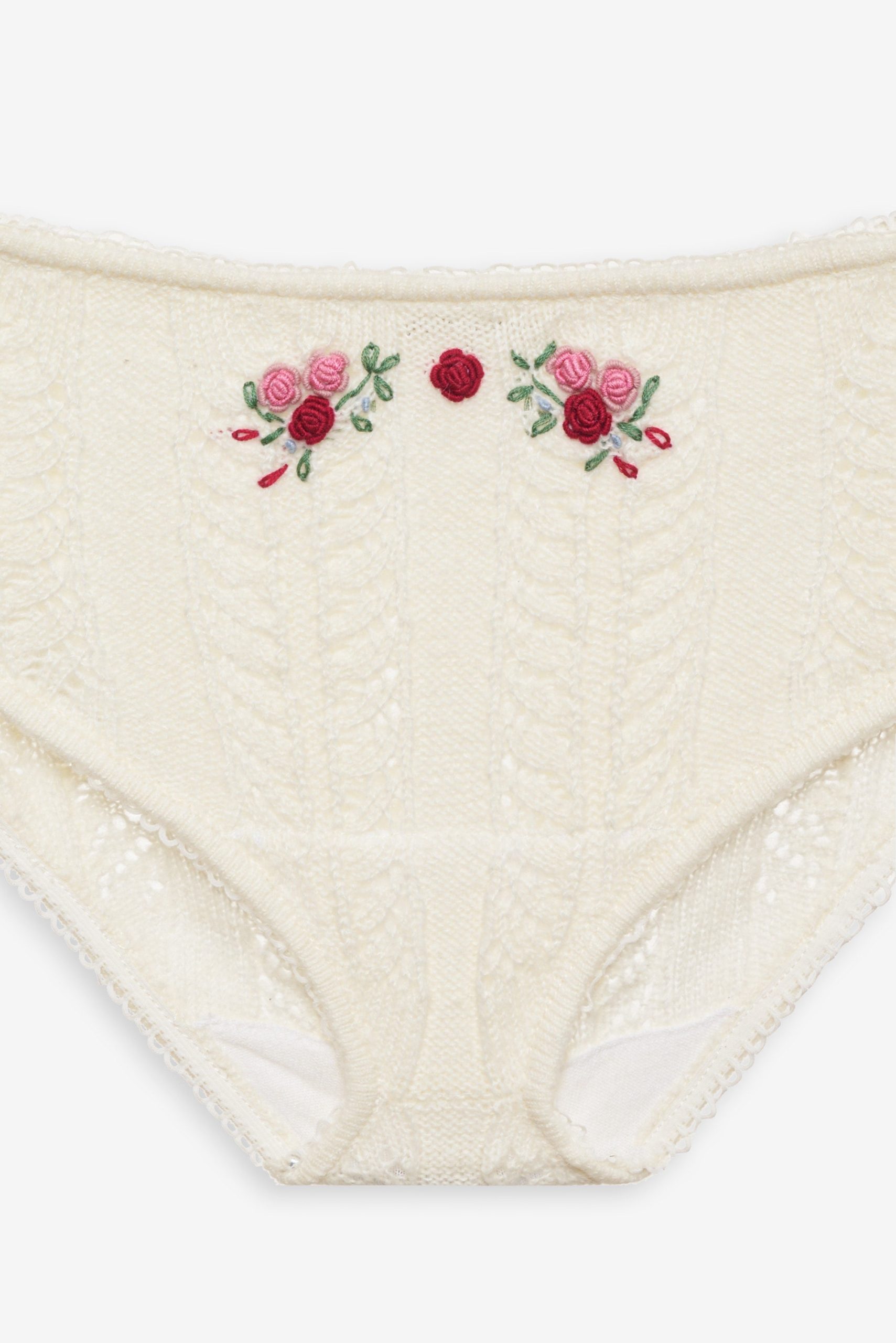 Made for cozy spring days, the Nathalie cheeky knit panty exudes vintage charm. Featuring intricate rosette embroidery, wide slotted ribbon trim, loop elastic trim, and a dainty satin bow appliqué—these knit hot pants are perfect for crisp spring days.