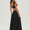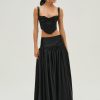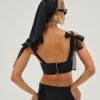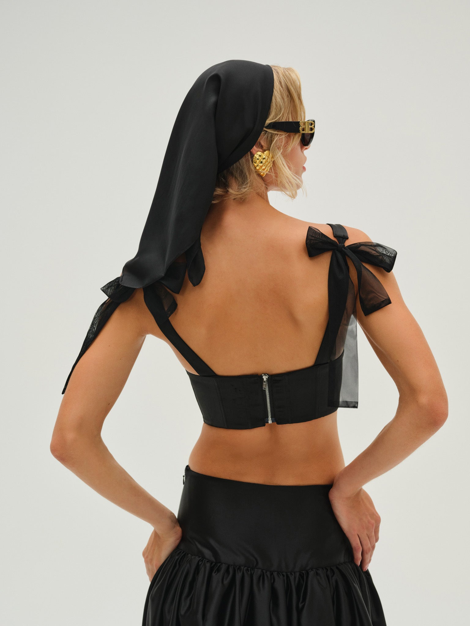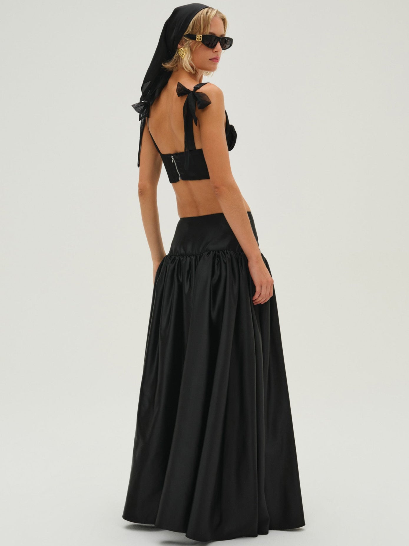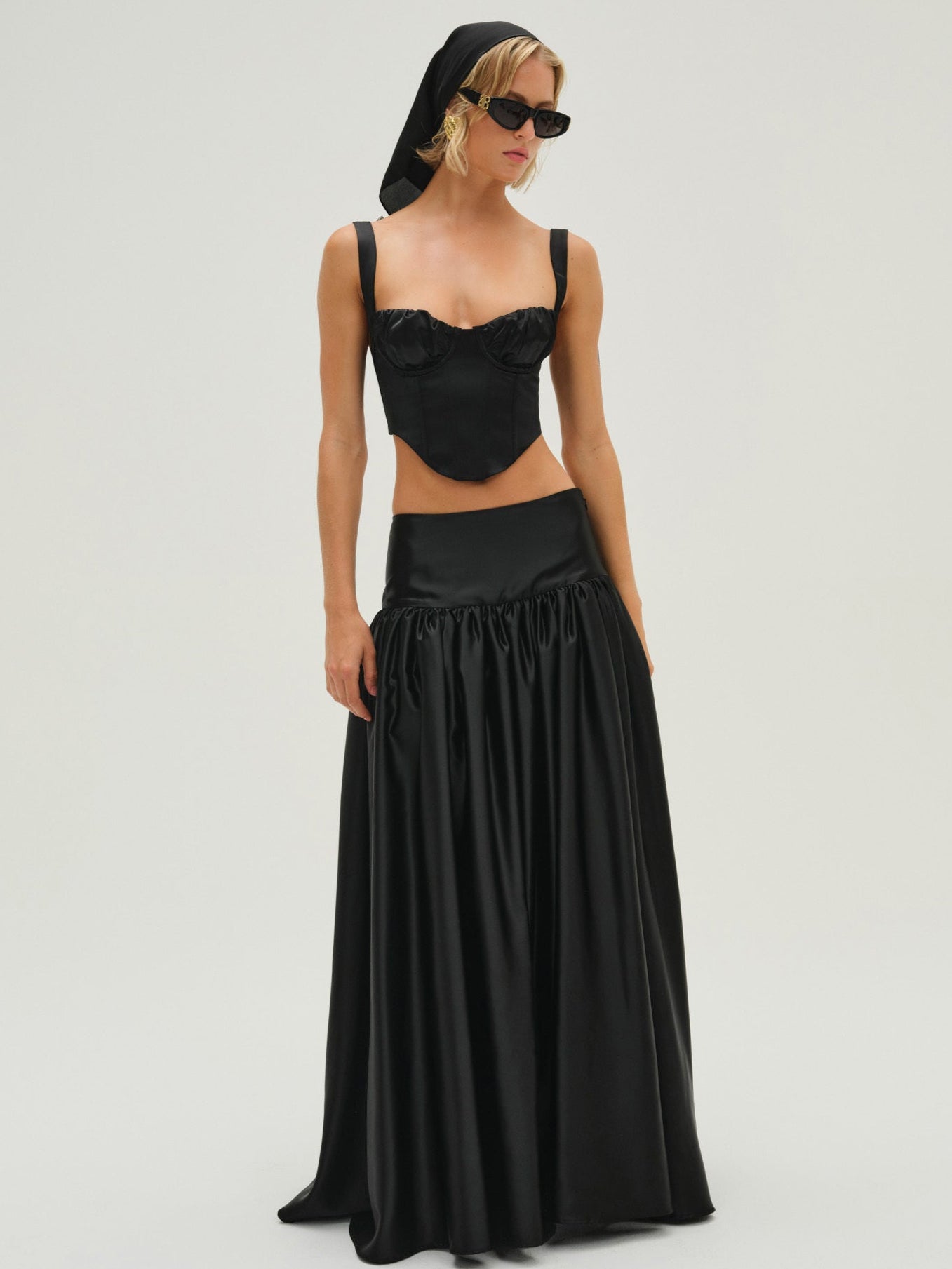 Designed to make an unforgettable entrance, the Nelly black top is crafted in heavyweight satin and featured ruched underwire cups with a boned bodice. This bustier top is defined by its chic tulle shoulder ties and flattering curved hem. Pair it with the Nelly Maxi Skirt for a co-ord skirt set.