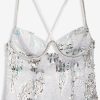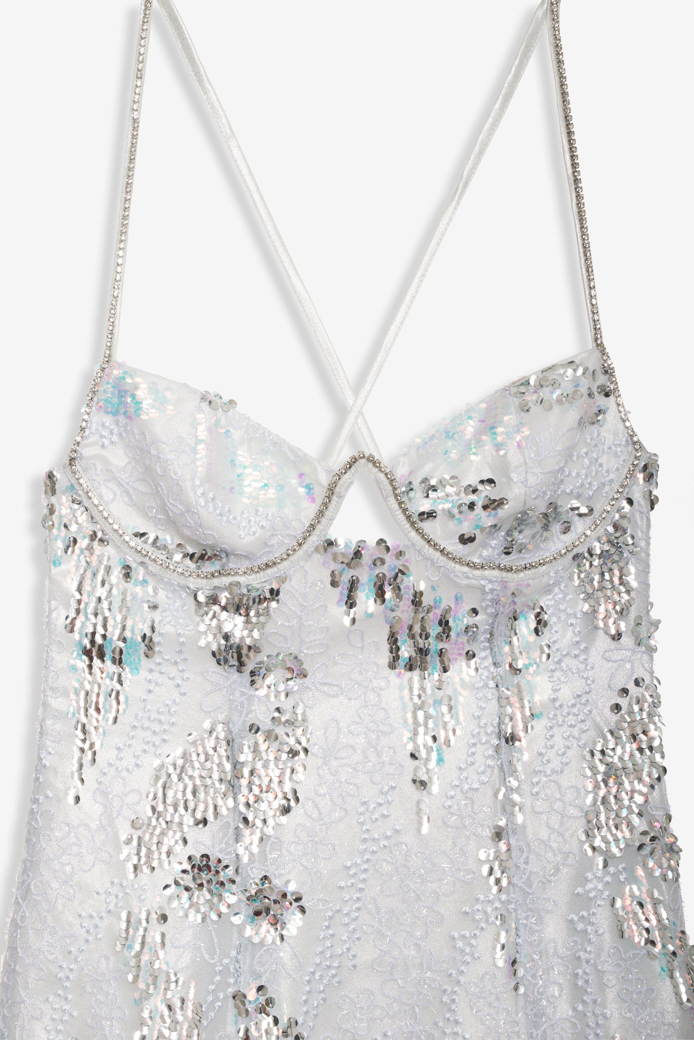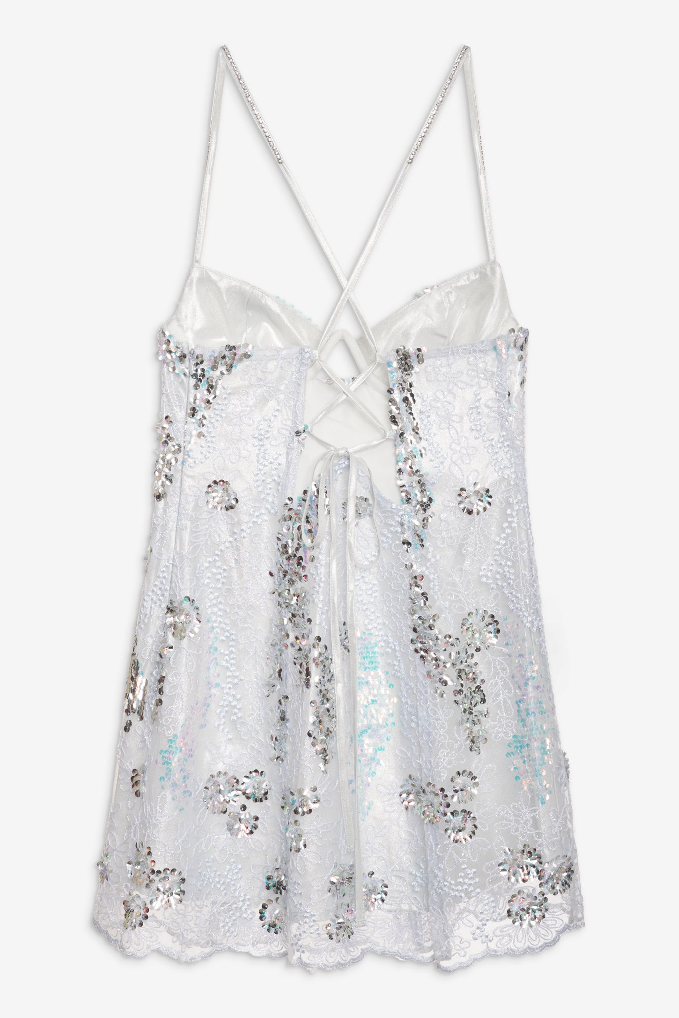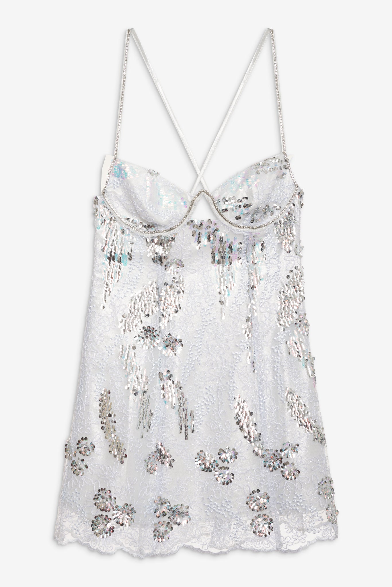 The Opal silver mini dress was imagined for your most festive winter moments. Crafted in intricate embellished lace, this striking party dress spotlights iridescent stone trim details.