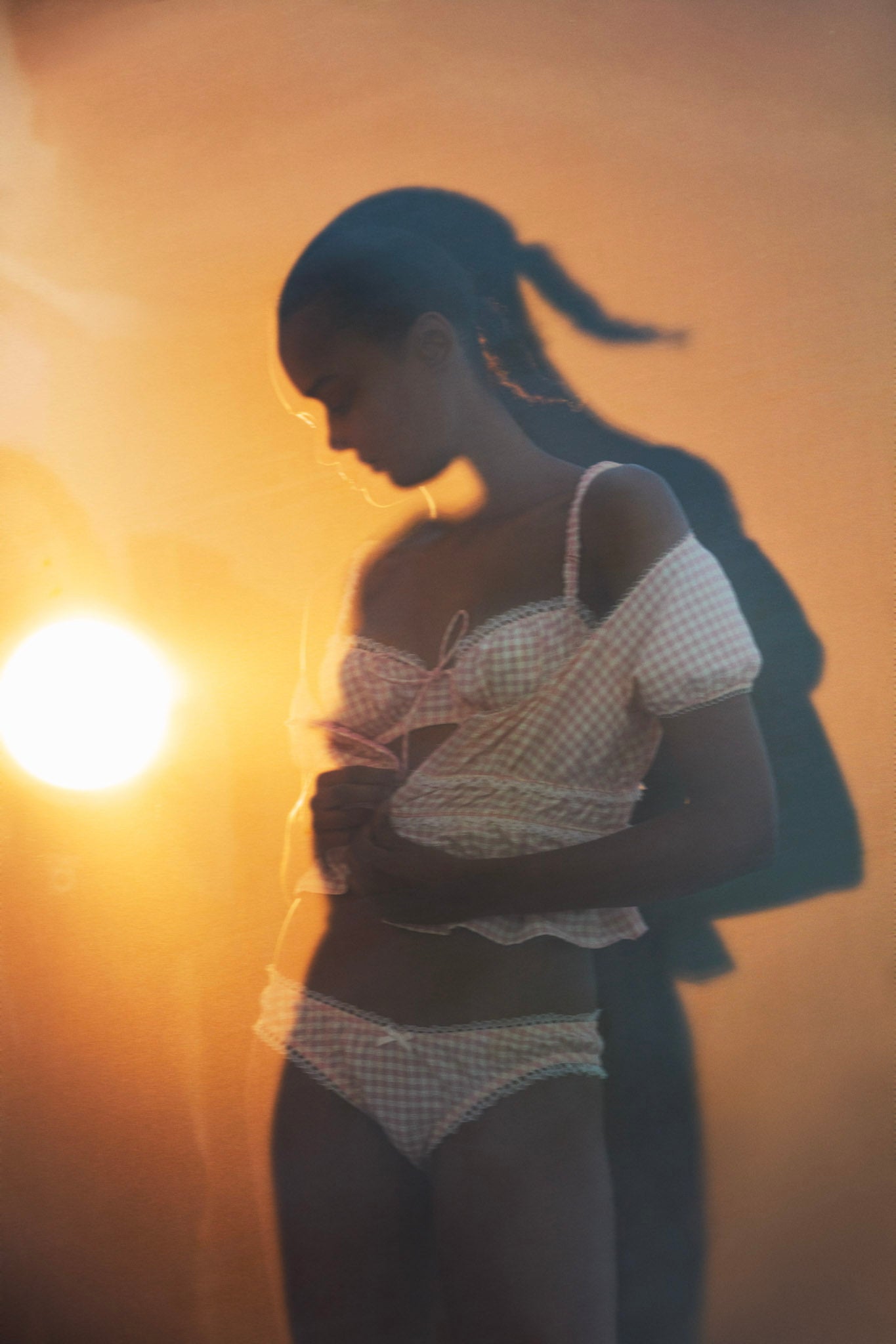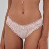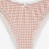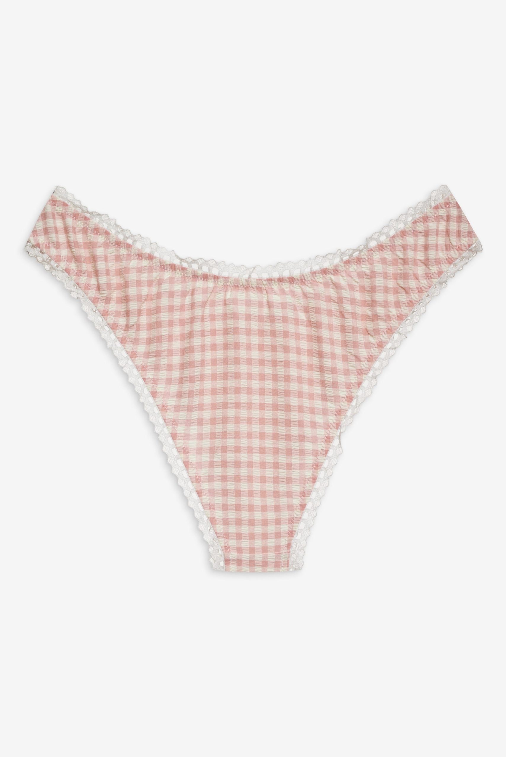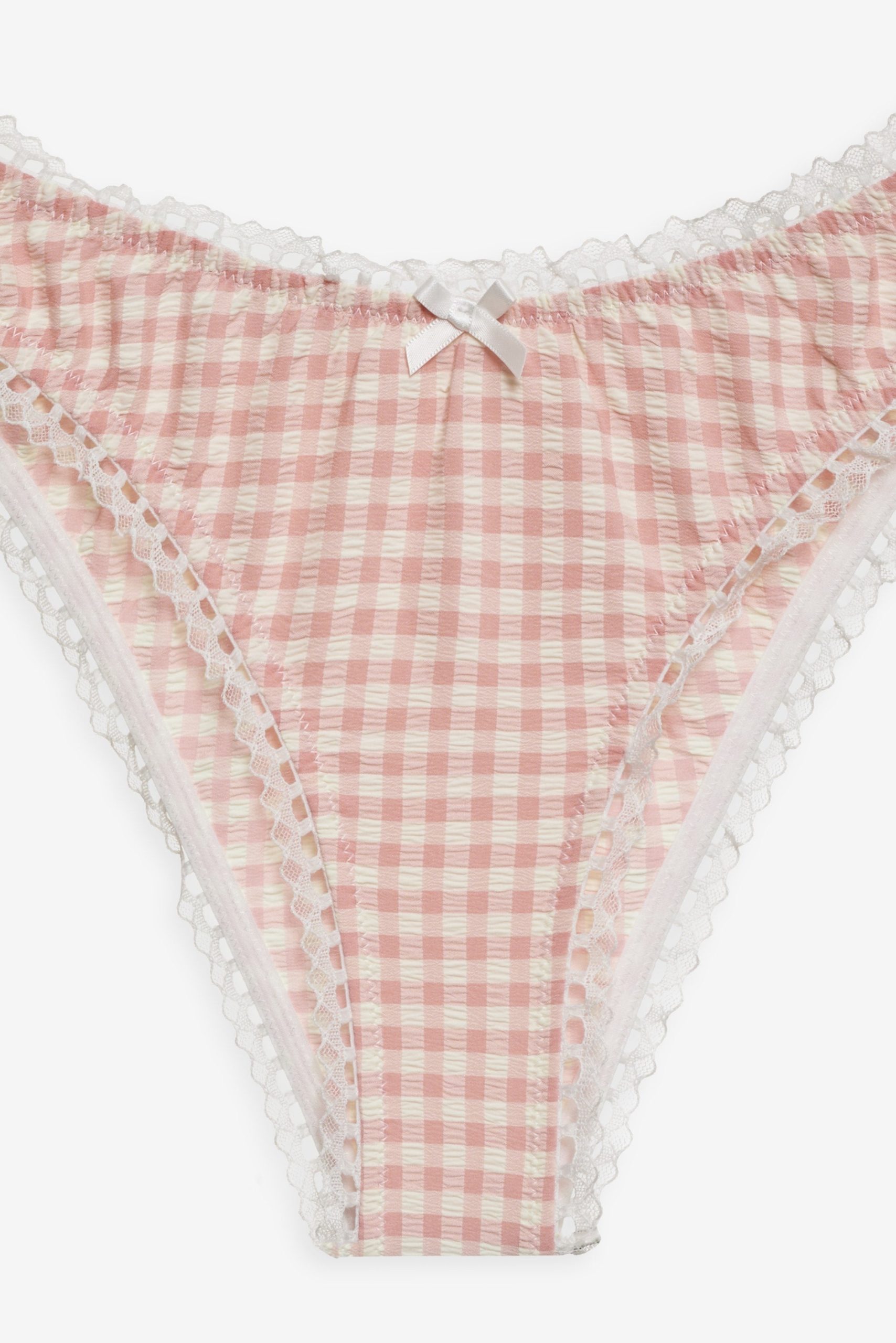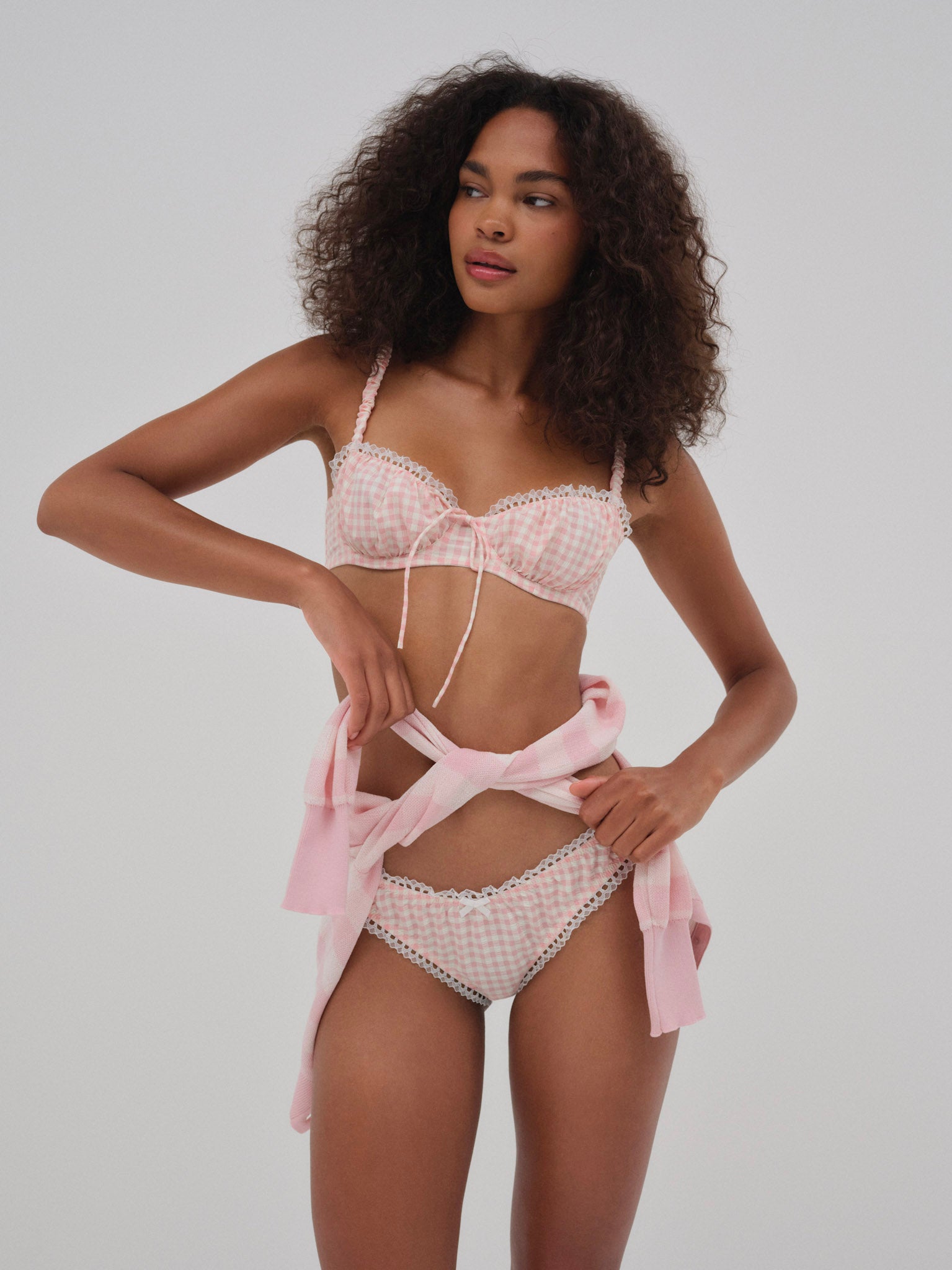 Crafted in a textured pink gingham fabric, the Petal gingham cheeky panty mirrors the warmth of a Mediterranean escape. This pink underwear is adorned with lace trims and a satin lingerie bow—pair it with the Petal Gingham Underwire Bra.