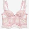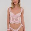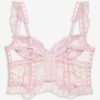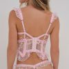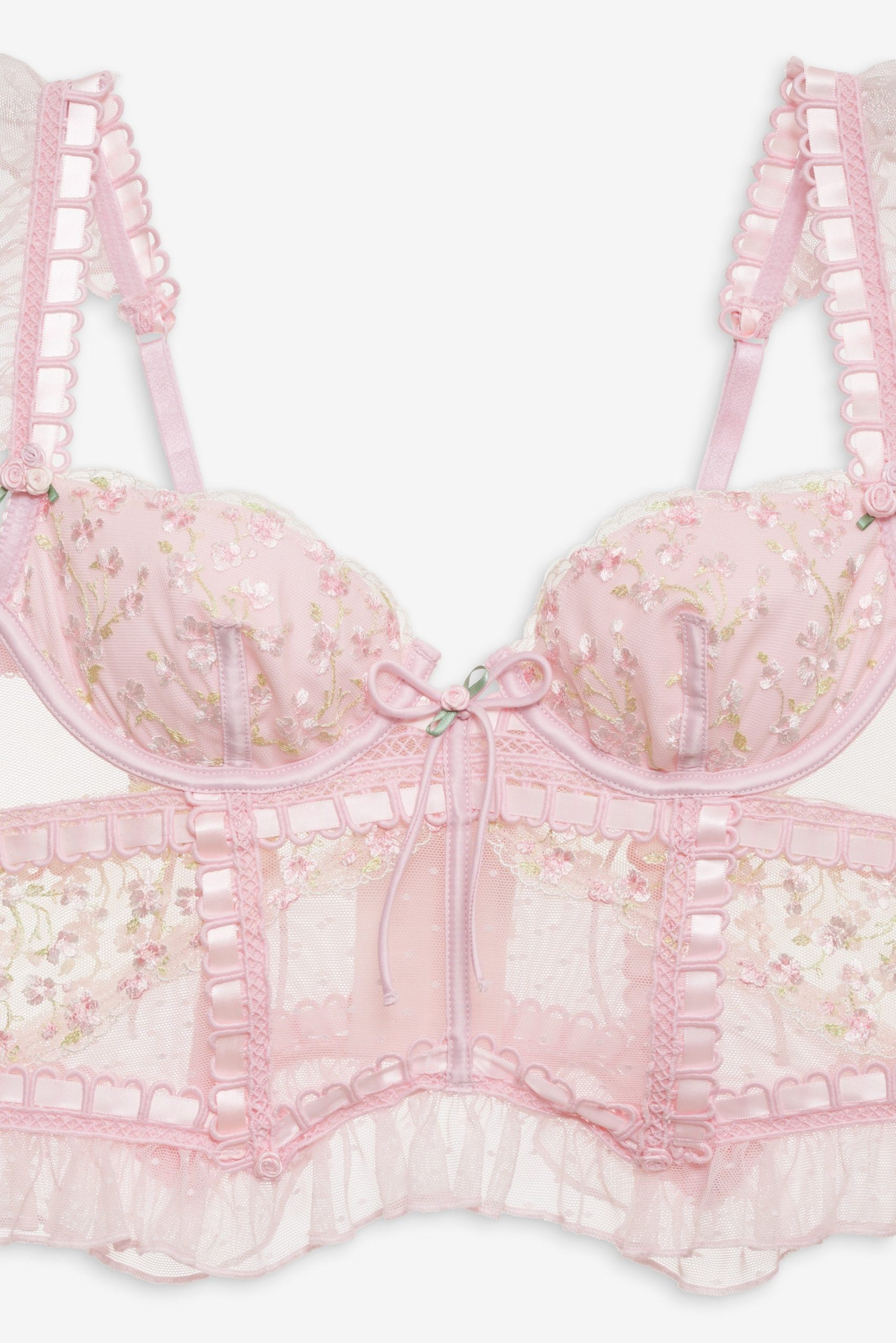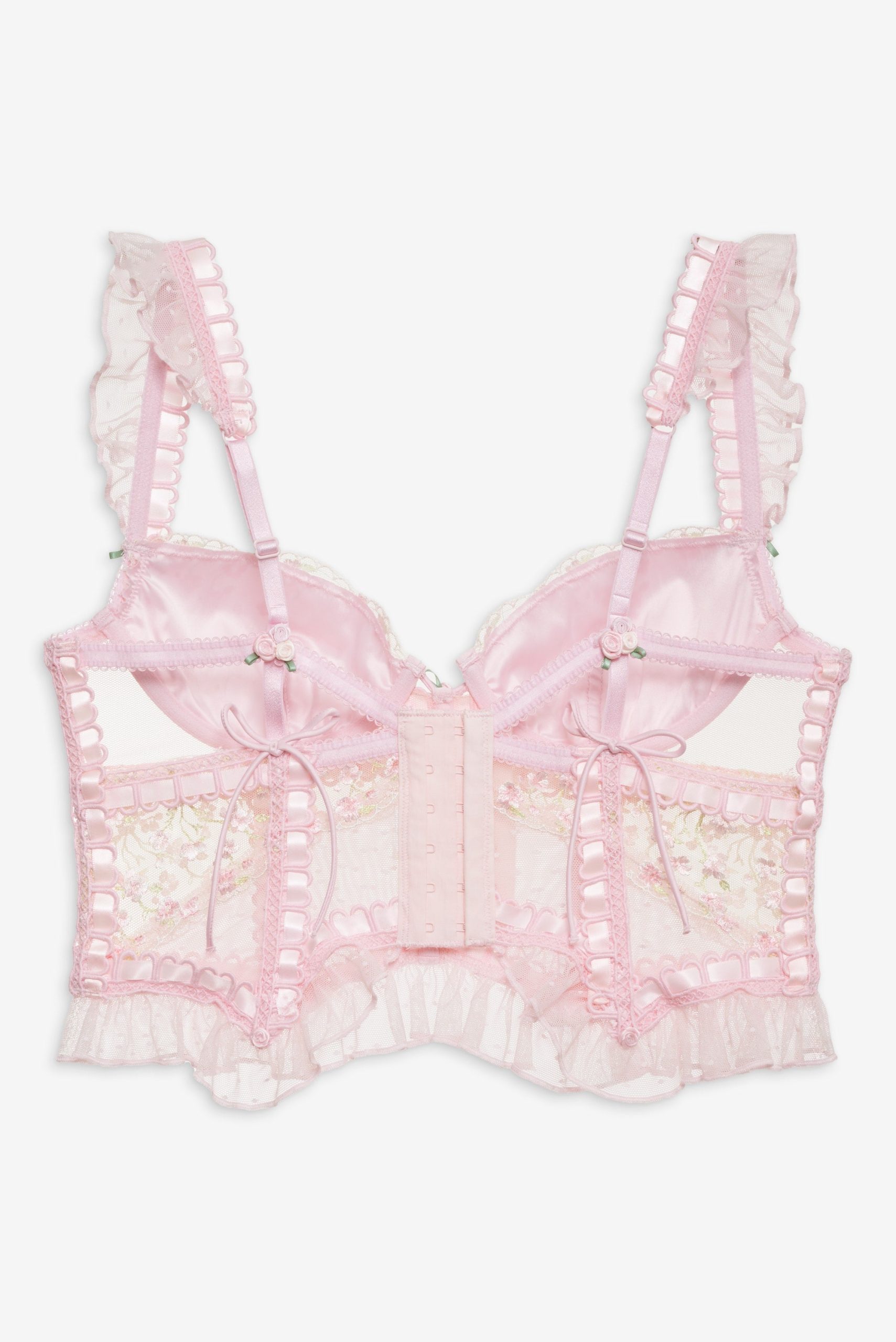 Designed for a romantic summer, the Peekaboo pink bustier exudes femininity with soft embroidered underwire cups and heavenly tulle ruffles at the hem and shoulders. This bustier top is finished with ribbon and loop trims and sweet rosettes.