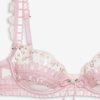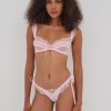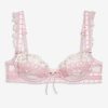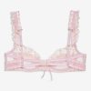 Designed for a romantic summer, the Pinkaboo pink underwire bra exudes femininity with soft embroidered cups, tulle ruffles at the shoulders, and triple ribbon rosette trims. This embroidered bra is completed with a lattice loop and ribbon trim.