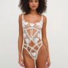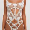 Fall in love with the Pure Heart blue & white mesh teddy–a lingerie bodysuit crafted in a romantic heart embroidered mesh. This thong bodysuit spotlights a sequin heart trim, lace bow appliqués, and a completely open back.