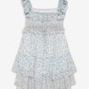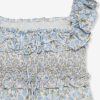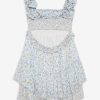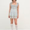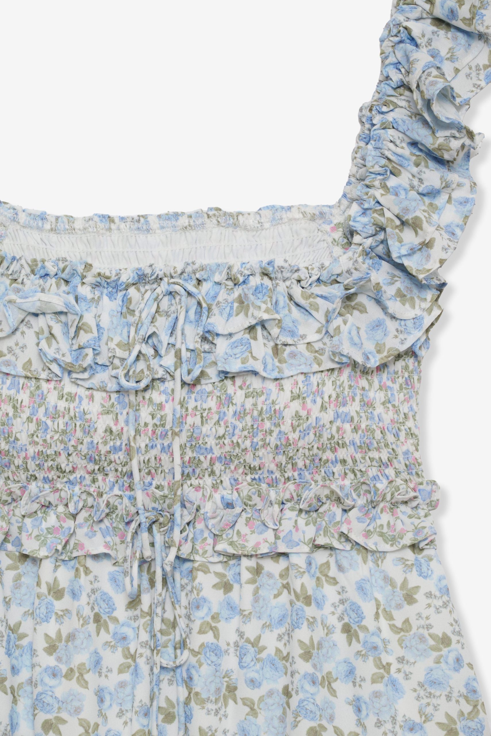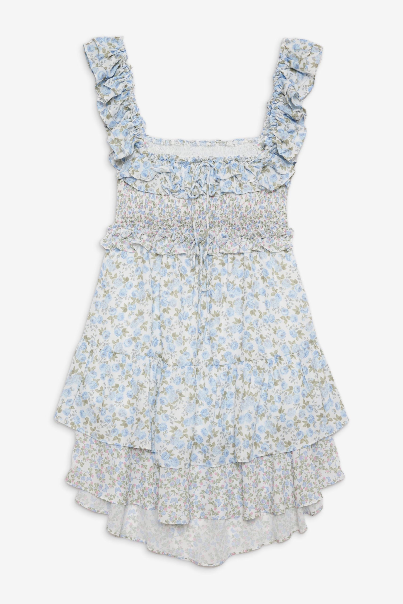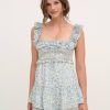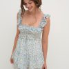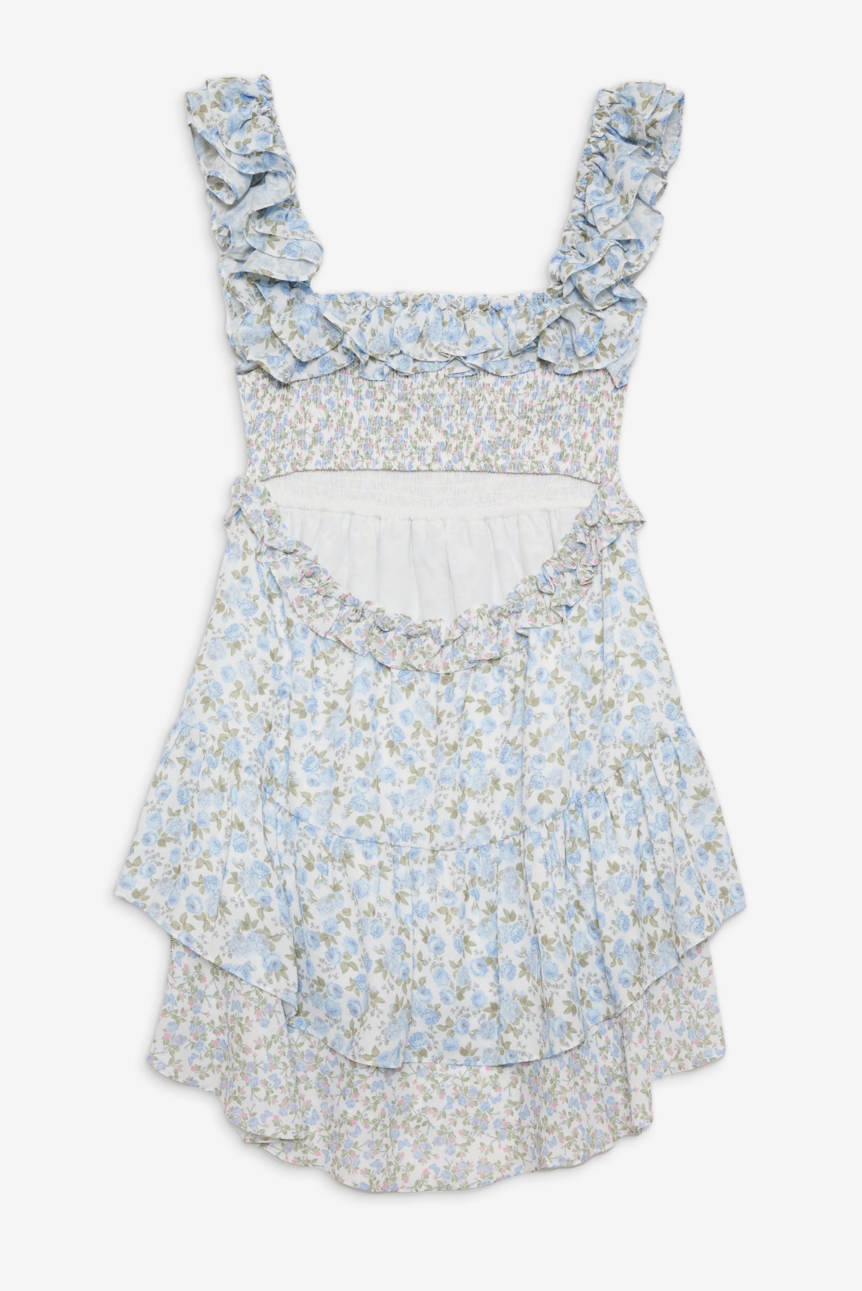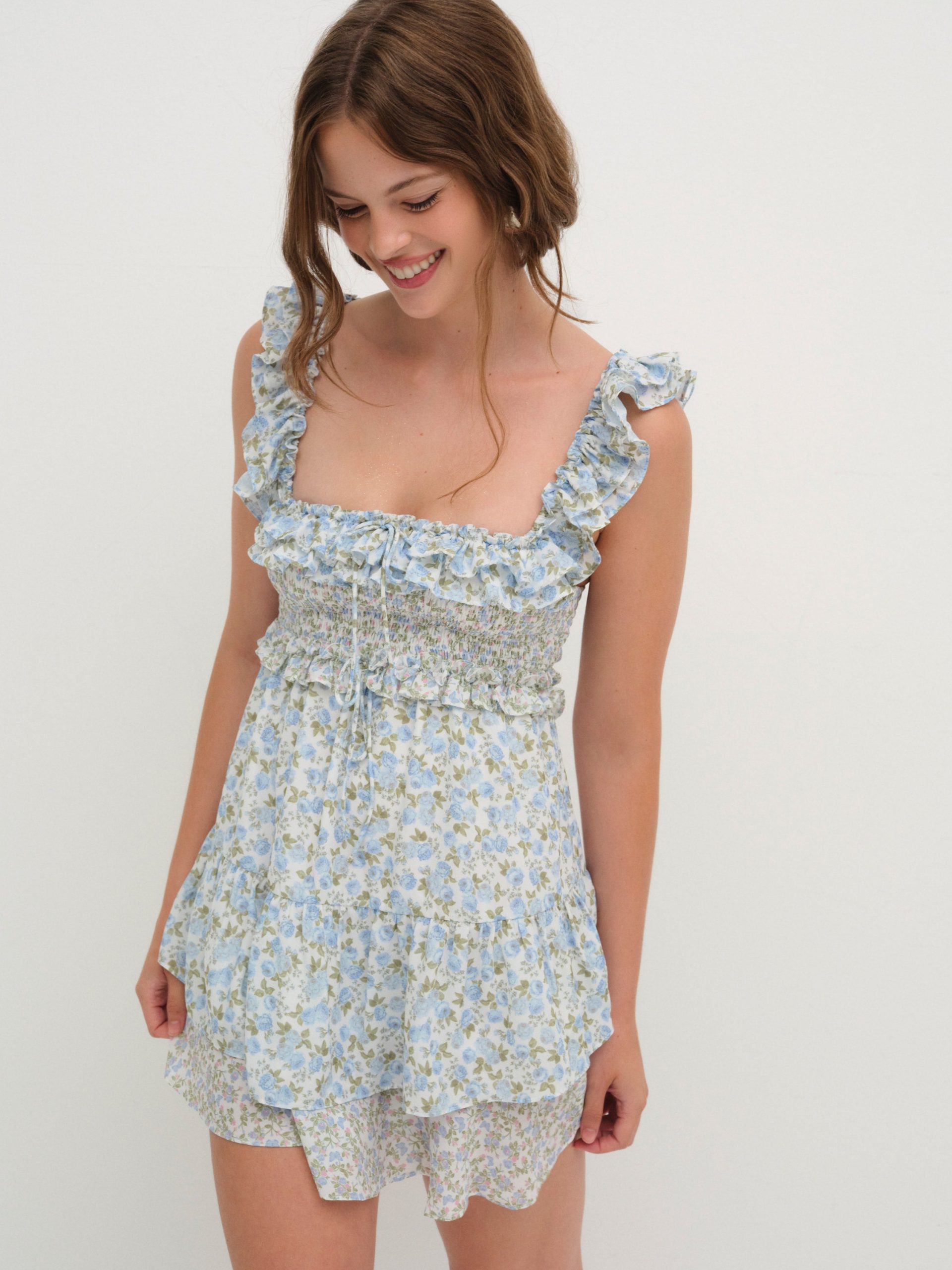 Perfect for capturing hearts, this vintage-inspired blue mini dress is your go-to for everyday elegance. Crafted in an allover garden floral print, this fit and flare dress has a squared ruffled neckline, a smocked bodice, and a full ruffled skirt.