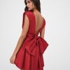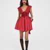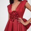 The holiday party dress of dreams, the Rose red mini dress has a plunging V-neckline and an oversized ruffled rosette at the center of the ruched waistband.