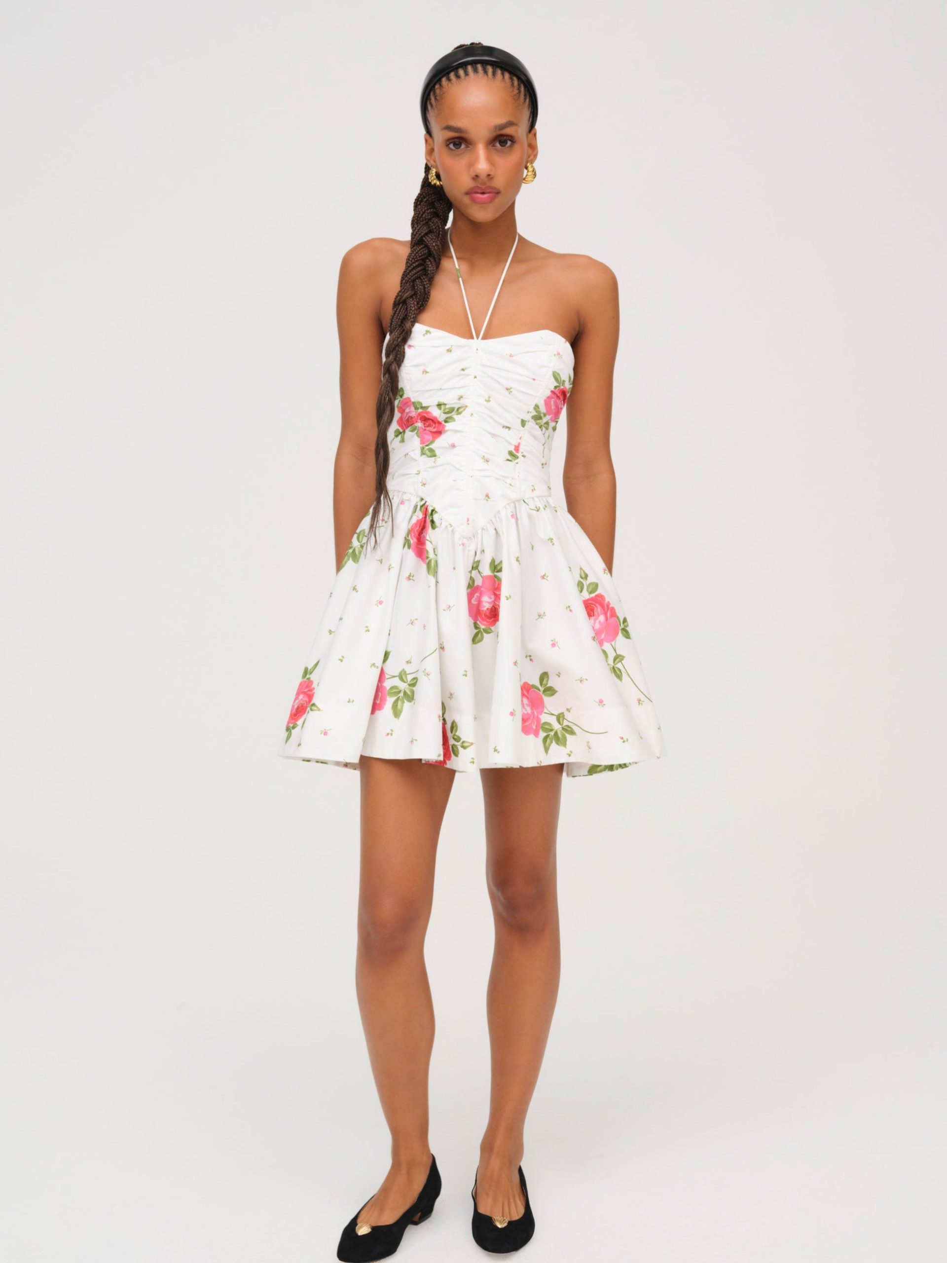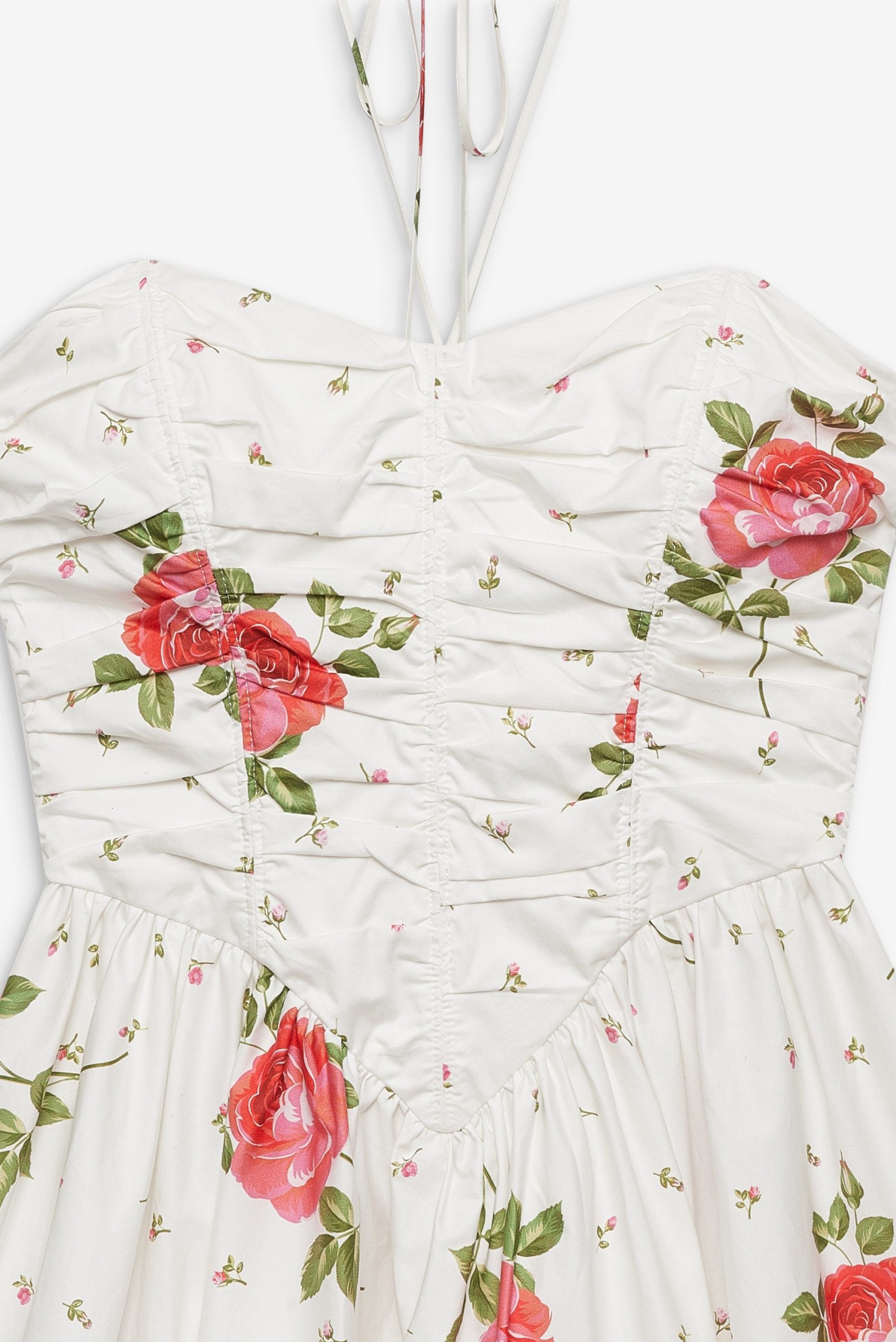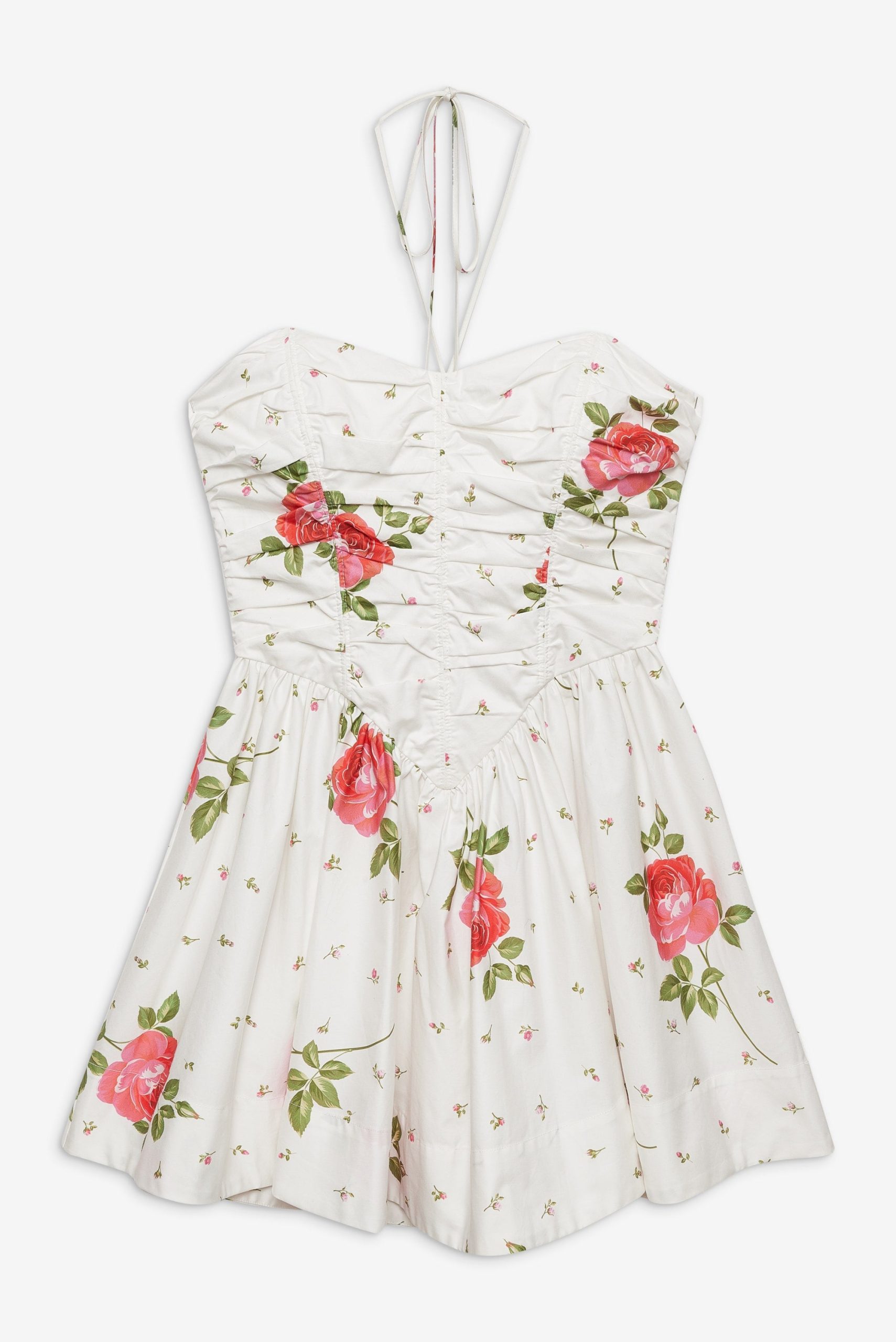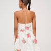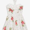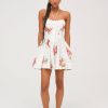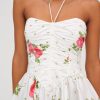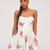 Adorned with a sweet allover floral print, the Rosebud Corset white mini dress exudes all things feminine. This floral mini dress spotlights a tight ruched bodice, dramatic pointed waist seam, and gathered full skirt for a flattering fit.