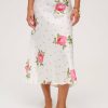 Adorned with a sweet allover floral print, the Rosebud white midi skirt exudes all things feminine. This floral midi skirt sits at low waist, and is bias cut for a flattering fit.