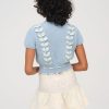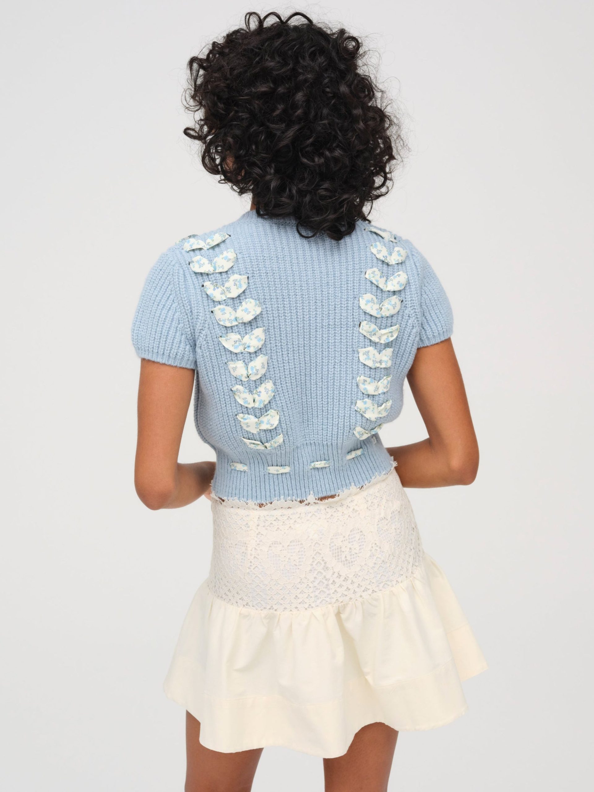 Make way for spring blooms in the Rosie ribbon blue crop top–a short sleeve sweater top with classic ribbed trim and adorned with ditsy floral printed satin ribbon that is woven throughout the body and ties at left waist.