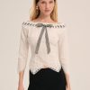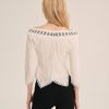 Feel ultra-chic by the lakeside with the Rosie Ribbon eyelet top–crafted in 100% cotton with a charming slotted gingham ribbon trim neckline. This off the shoulder top spotlights an asymmetrical hem and 3/4 length sleeves for an elevated look.