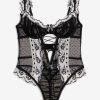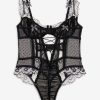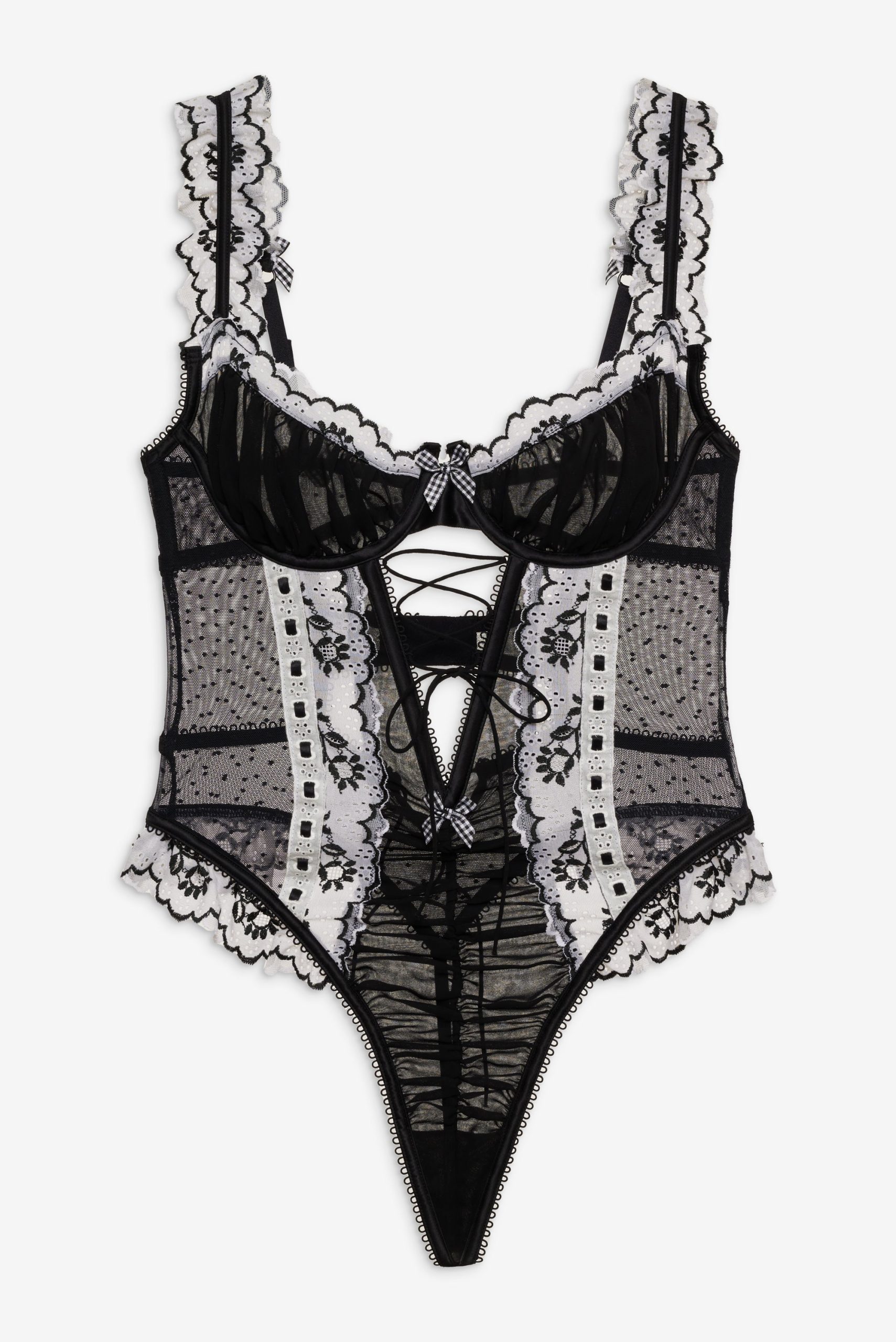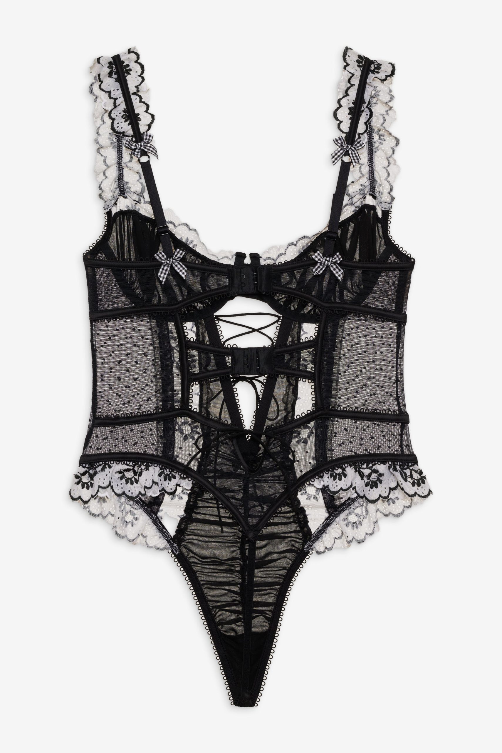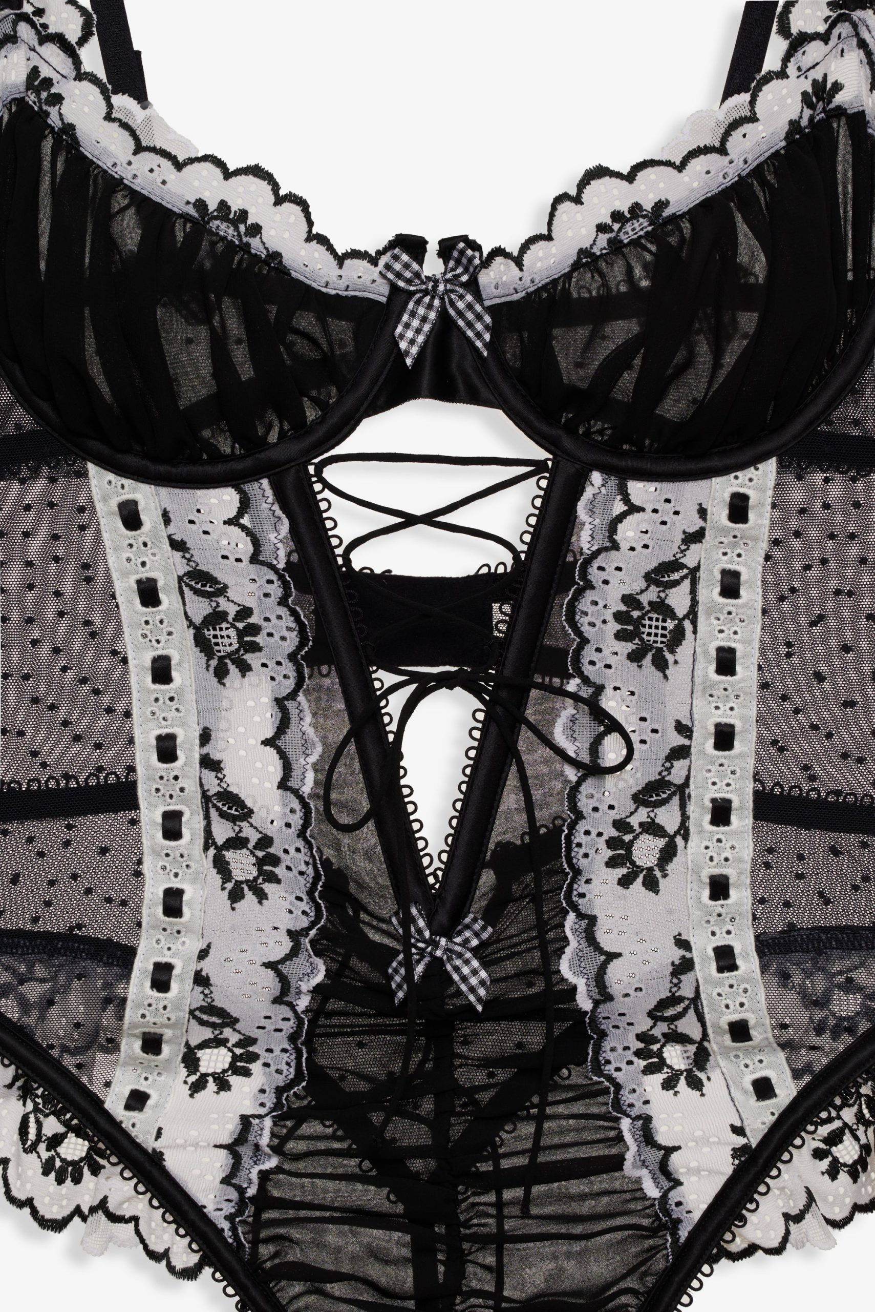Ultra-sexy, with everyday wearability, the Rubee black teddy is inspired by vintage French lingerie. Crafted in dotted mesh with contrast lace and slotted-ribbon eyelet trims, this underwire bodysuit with ruched satin cups can be worn in or out for sultry dinner dates.