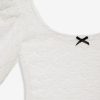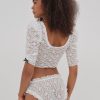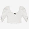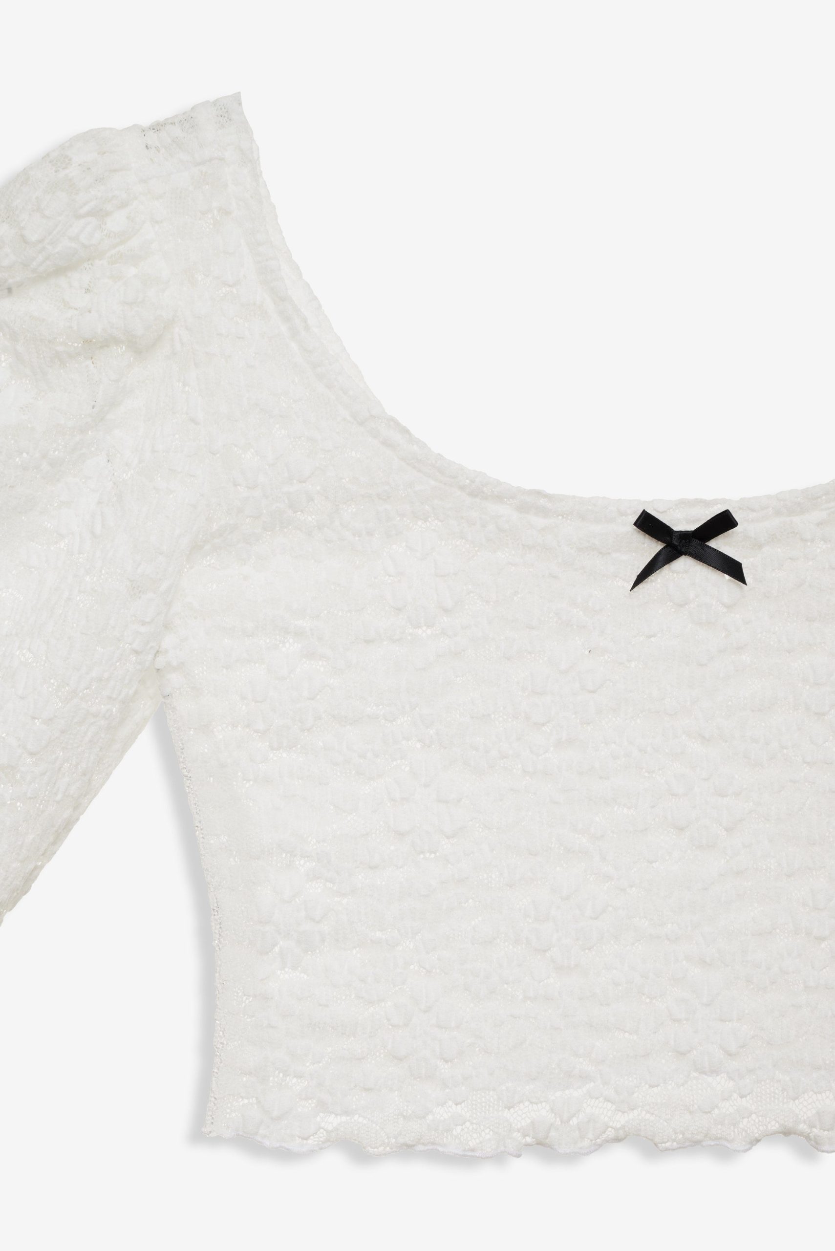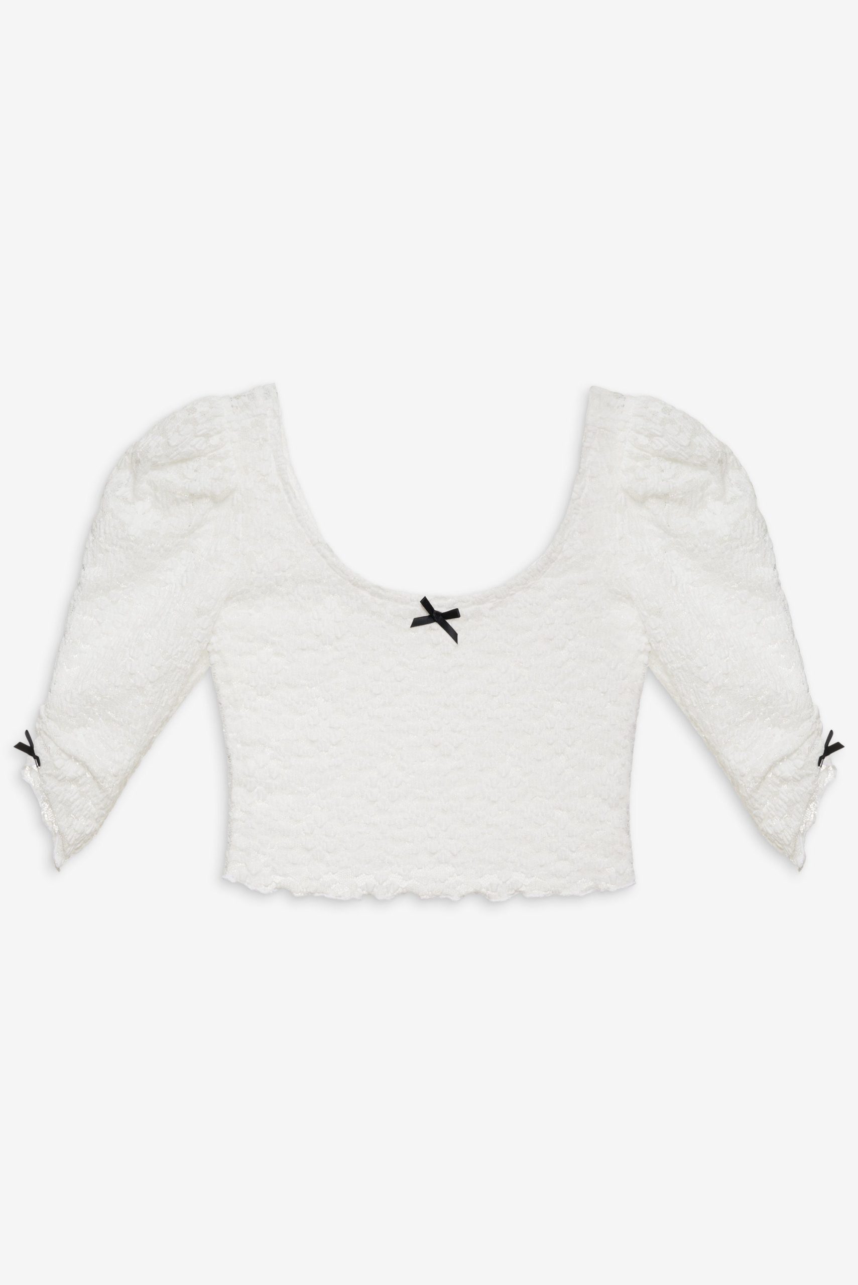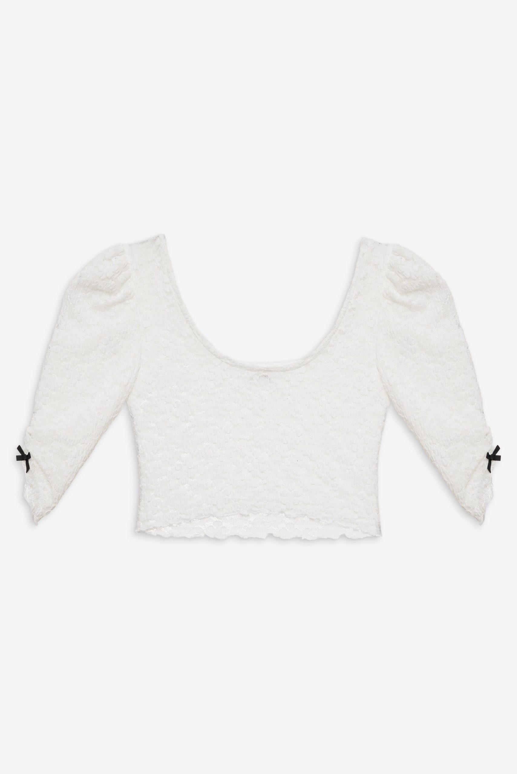 Made for barefoot walks in the grass, the Sally Stretch lace top is for the effortless beauty. Crafted in an intricate floral stretch lace, this scoop neck baby tee top features 3/4 length sleeves, a dainty lettuce edge hem, and decorative contrast bows throughout.