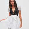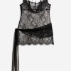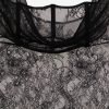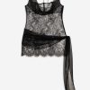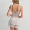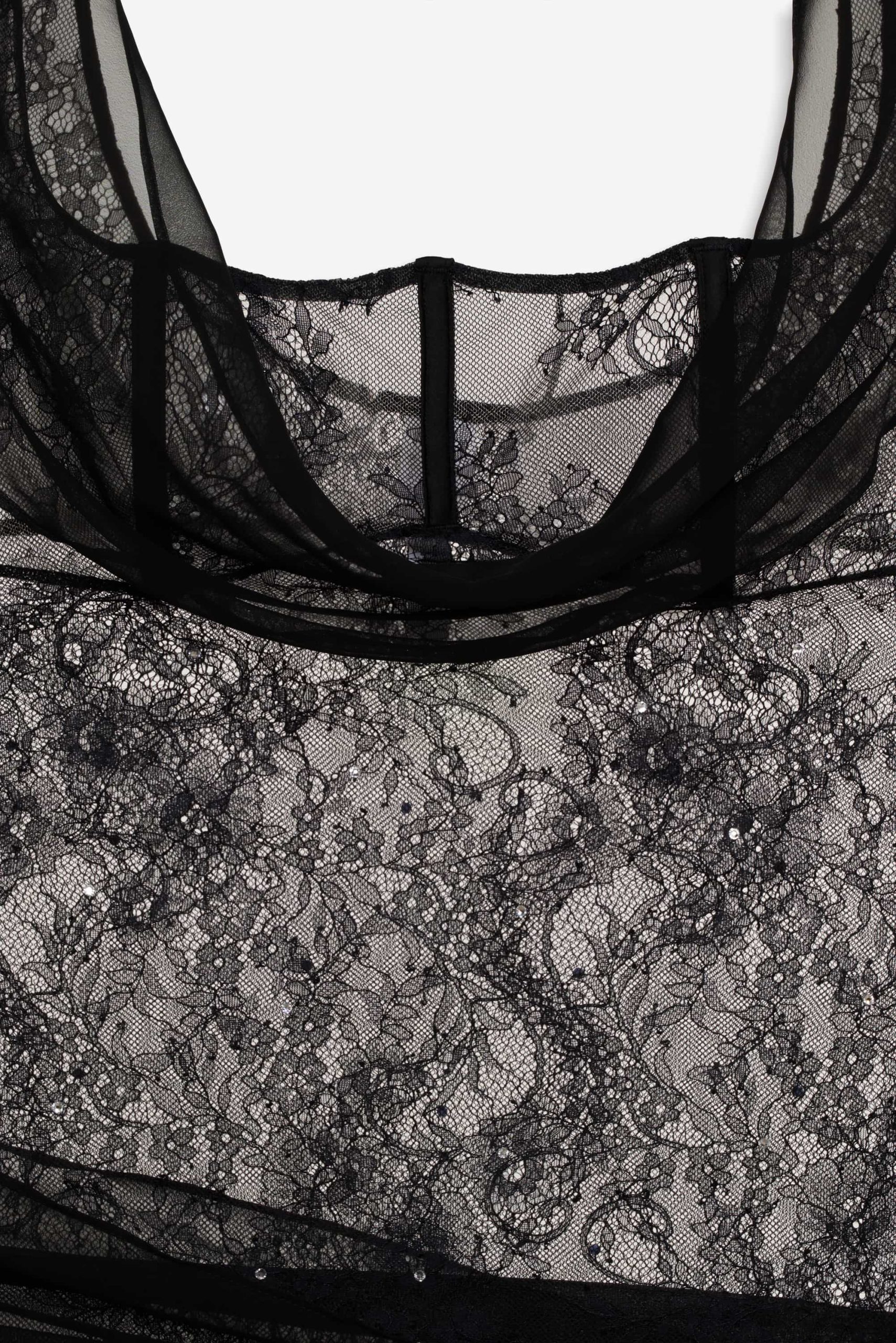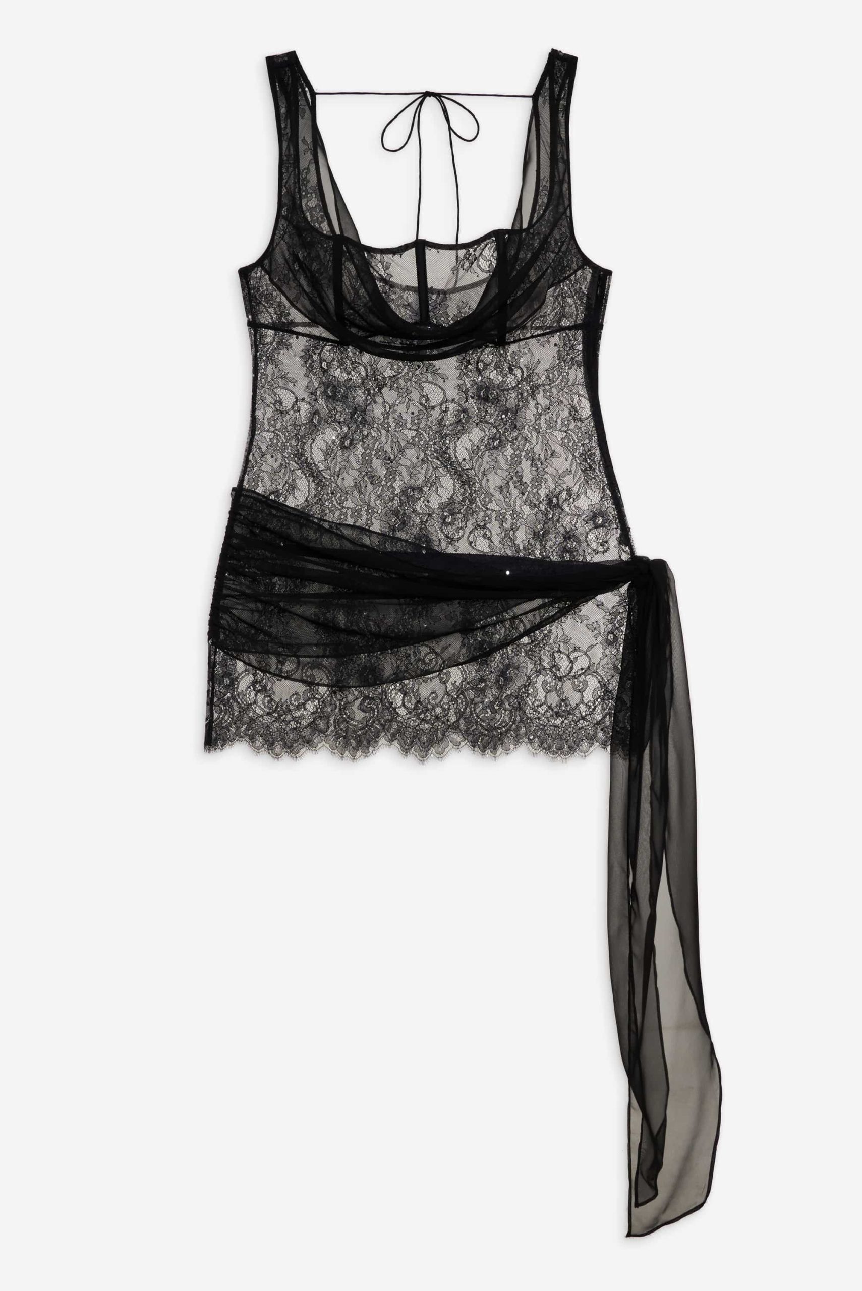 Designed for the romantic who craves the spotlight, the Sonja black slip dress is an ultra-sexy mini slip for evenings in—or out. Adorned with scattered rhinestones throughout, this sheer lace mini dress features a chiffon cowl neckline, a functional sash draped over the hip, and a scalloped-edge hem.
