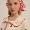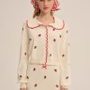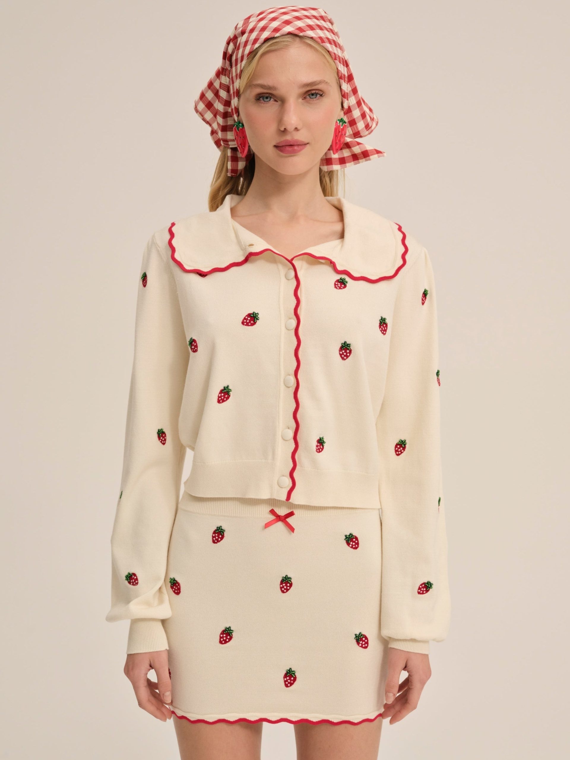 Go berry picking in the charming Strawberry Jam cream cardigan—a beaded cardigan sweater with strawberry embroidery, red scalloped edges, and an oversized Peter Pan collar. Pair this cardi with the Strawberry Jam Mini Skirt for a complete co-ord set.