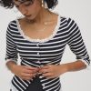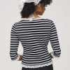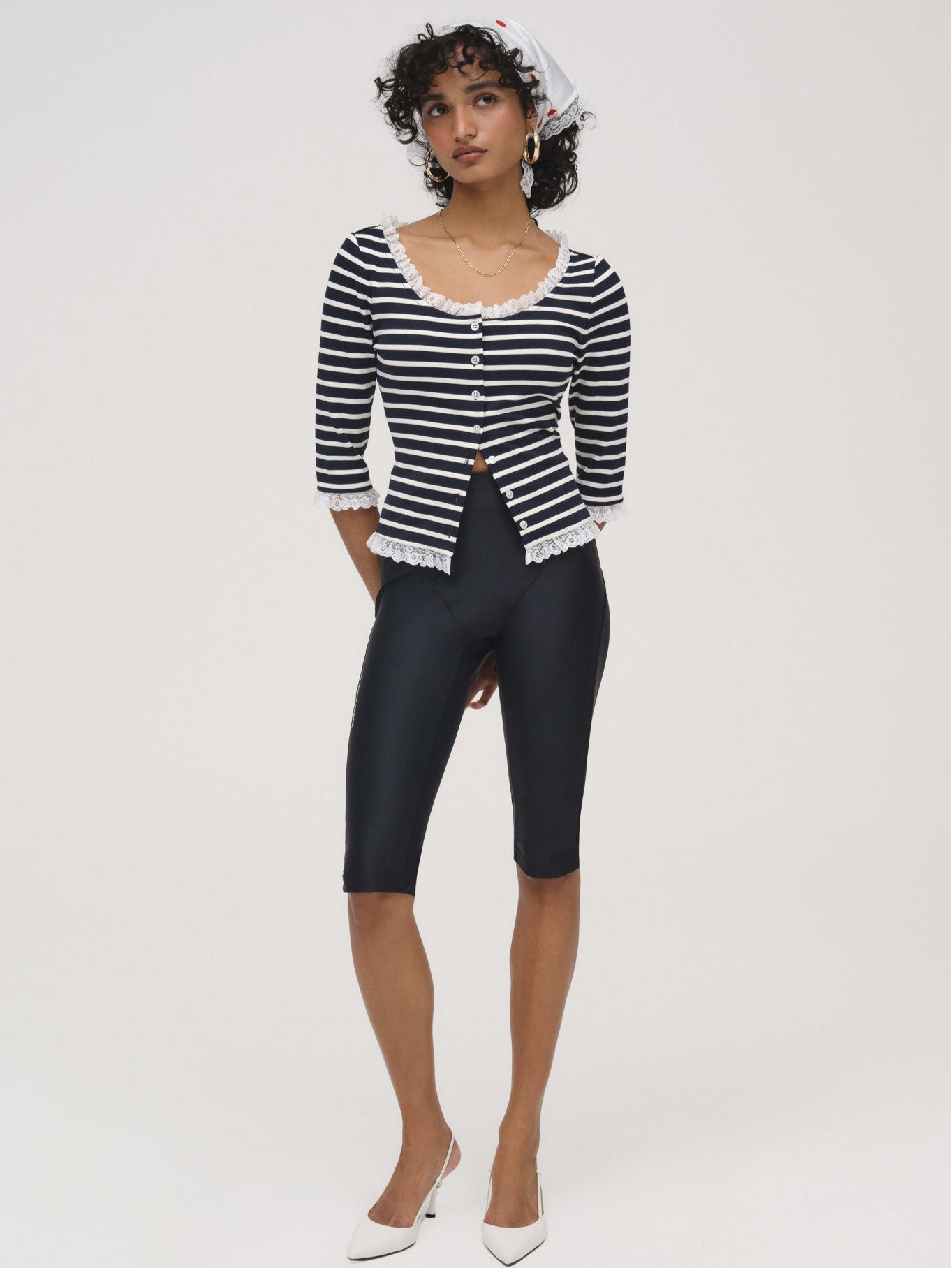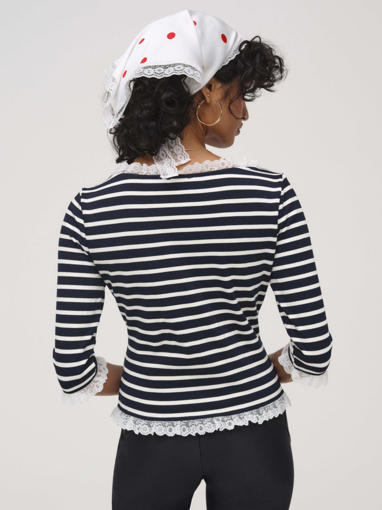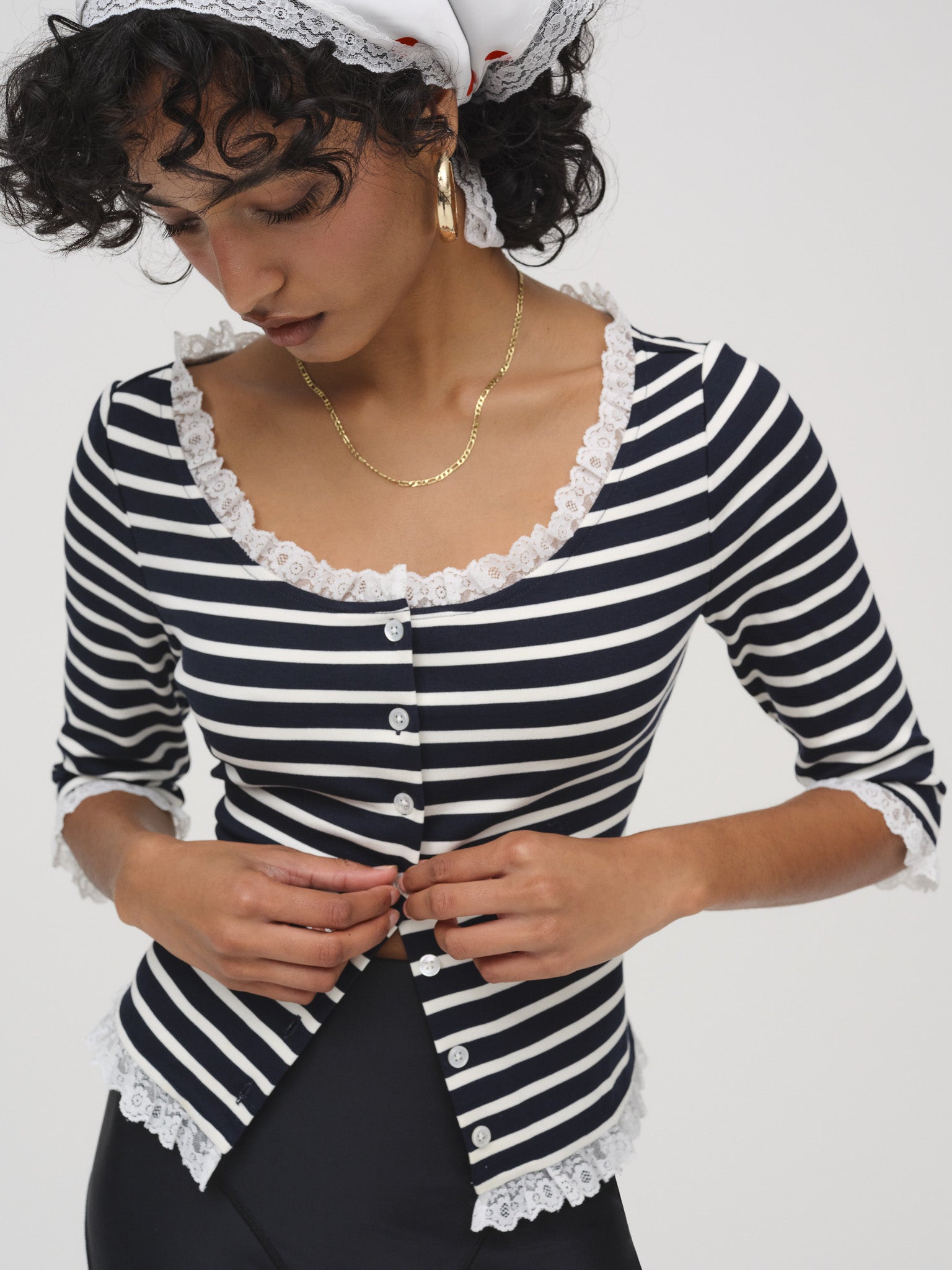 The Suzette stripe knit cardigan exudes a timeless French aesthetic. Crafted in a cozy knit, this striped button down sweater has a wide scooped boat neck and is adorned with lace trims plus fitted three-quarter length sleeves.