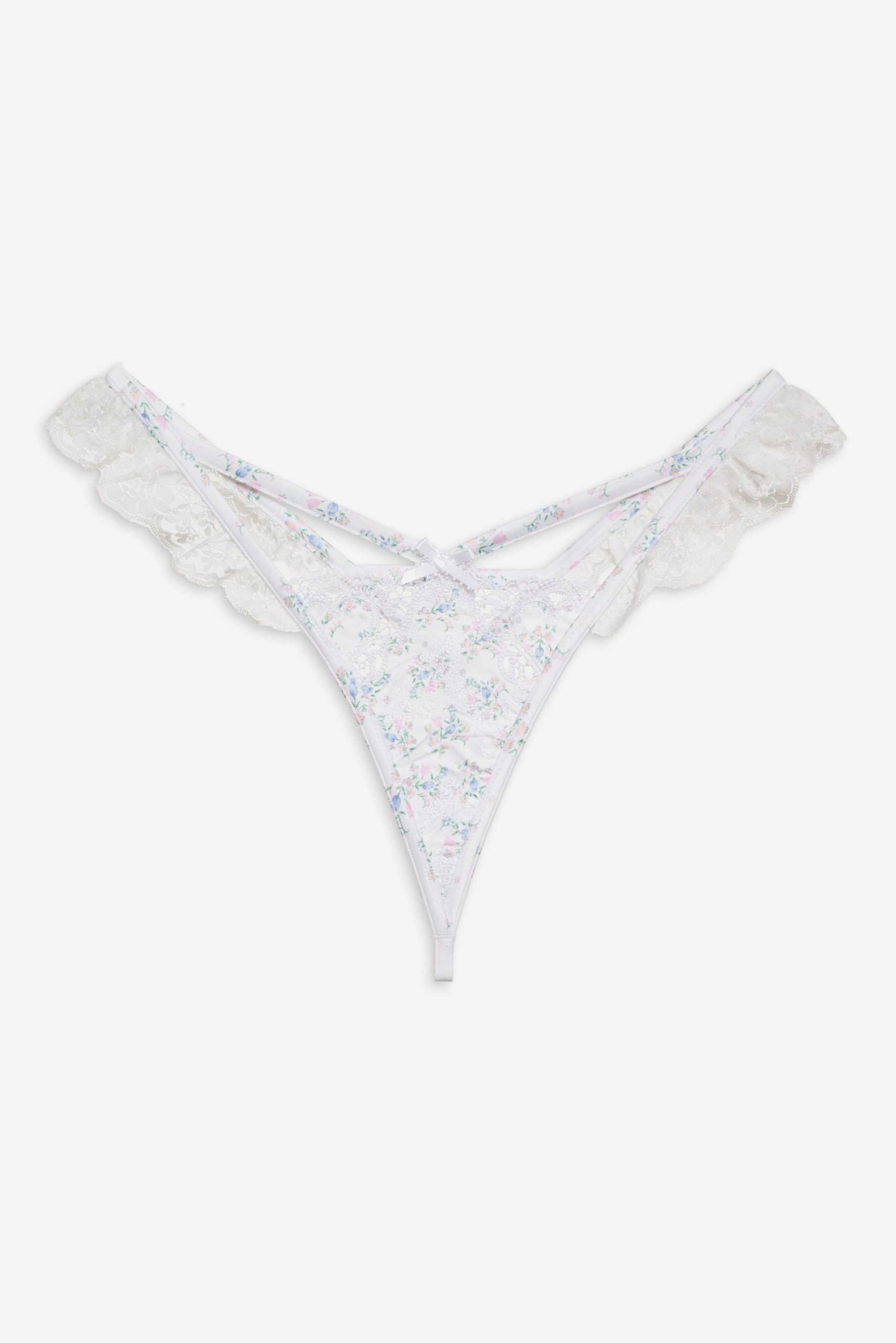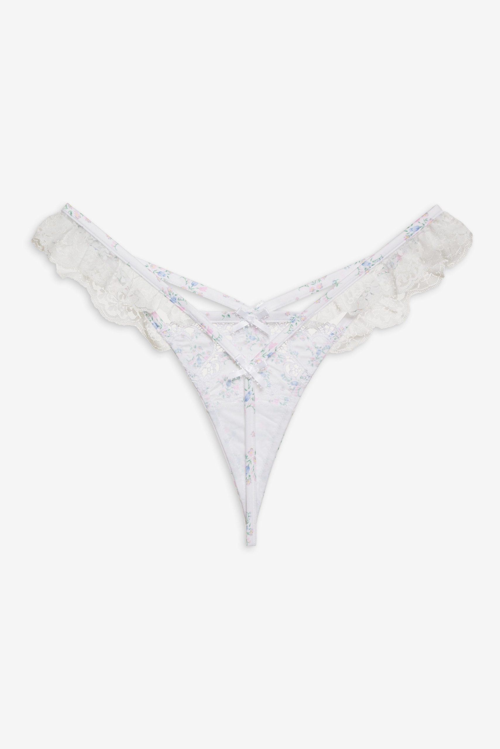 Inspired by heavenly European summers, the Sweet Escape white thong exudes timeless femininity. This embroidered g-string is crafted in a floral printed satin and features lace ruffles at the neckline and satin lingerie bows. Pair it with the Sweet Escape Underwire Bra for a co-ord lingerie set.