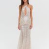 Designed for the modern mermaid, the Sydney nude sequin mini dress captivates with its all over pearlescent sequins that echo the ocean’s treasures. Featuring a low open back and flared skirt, this sparkly dress is completed with fixed rosettes and cascading chiffon ruffles that capture the rhythm and ripples of soft summer waves.