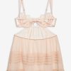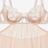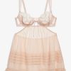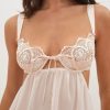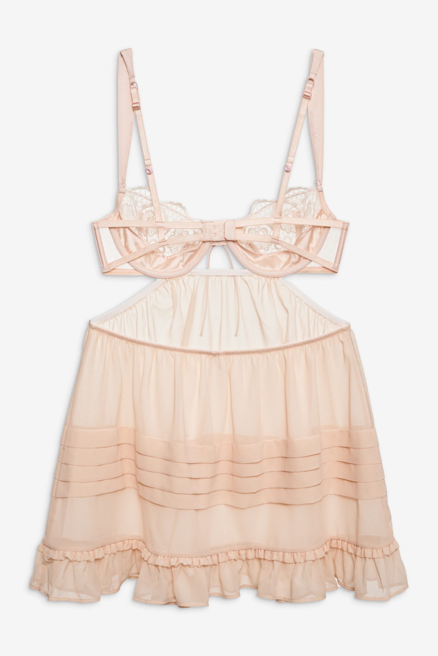 Elevate everyday summer rituals with the Tea Cake underwire slip dress. Crafted in a pastel peach chiffon, this sheer babydoll is adorned with lace embroidered cups, gathered pin tucks, and a ruffled hem.