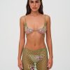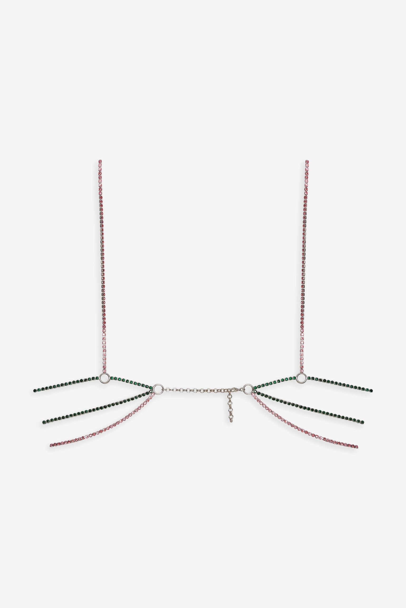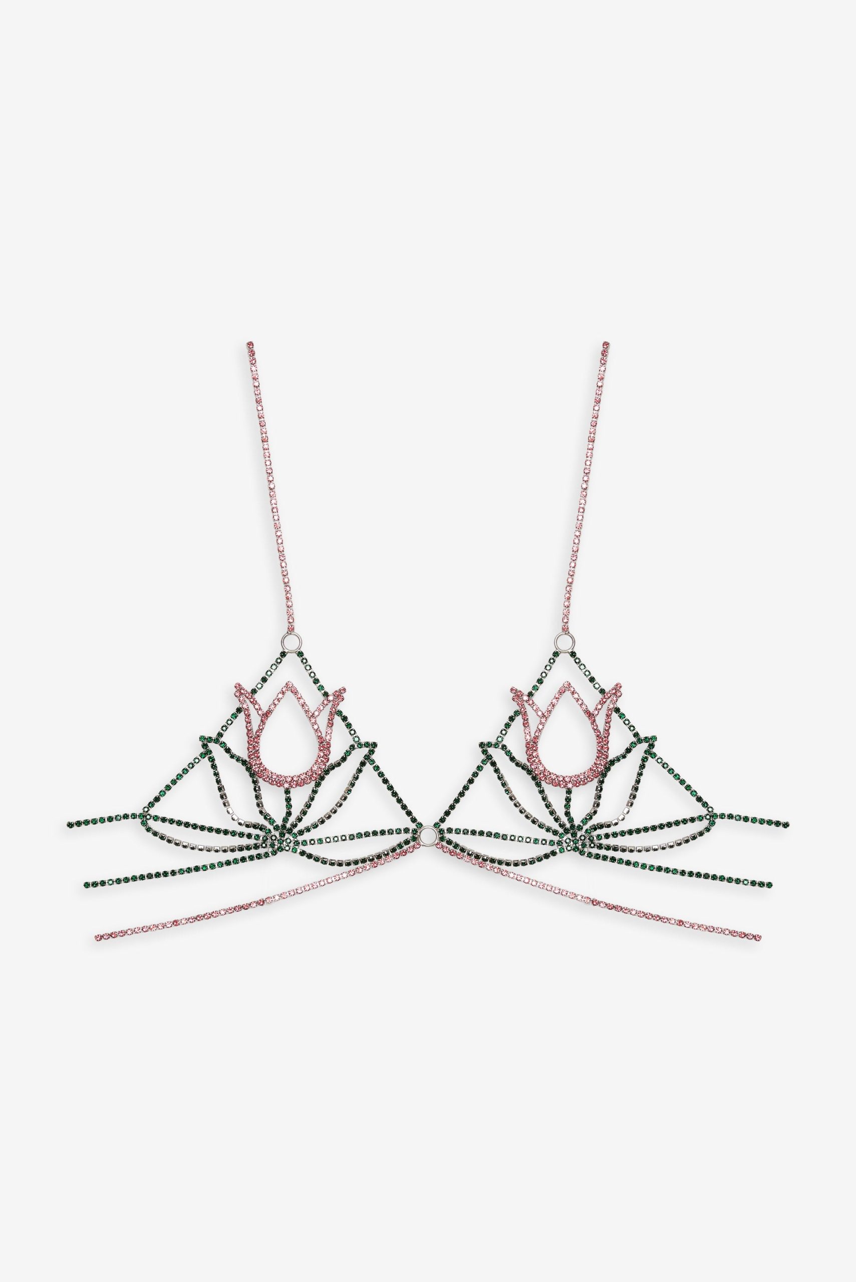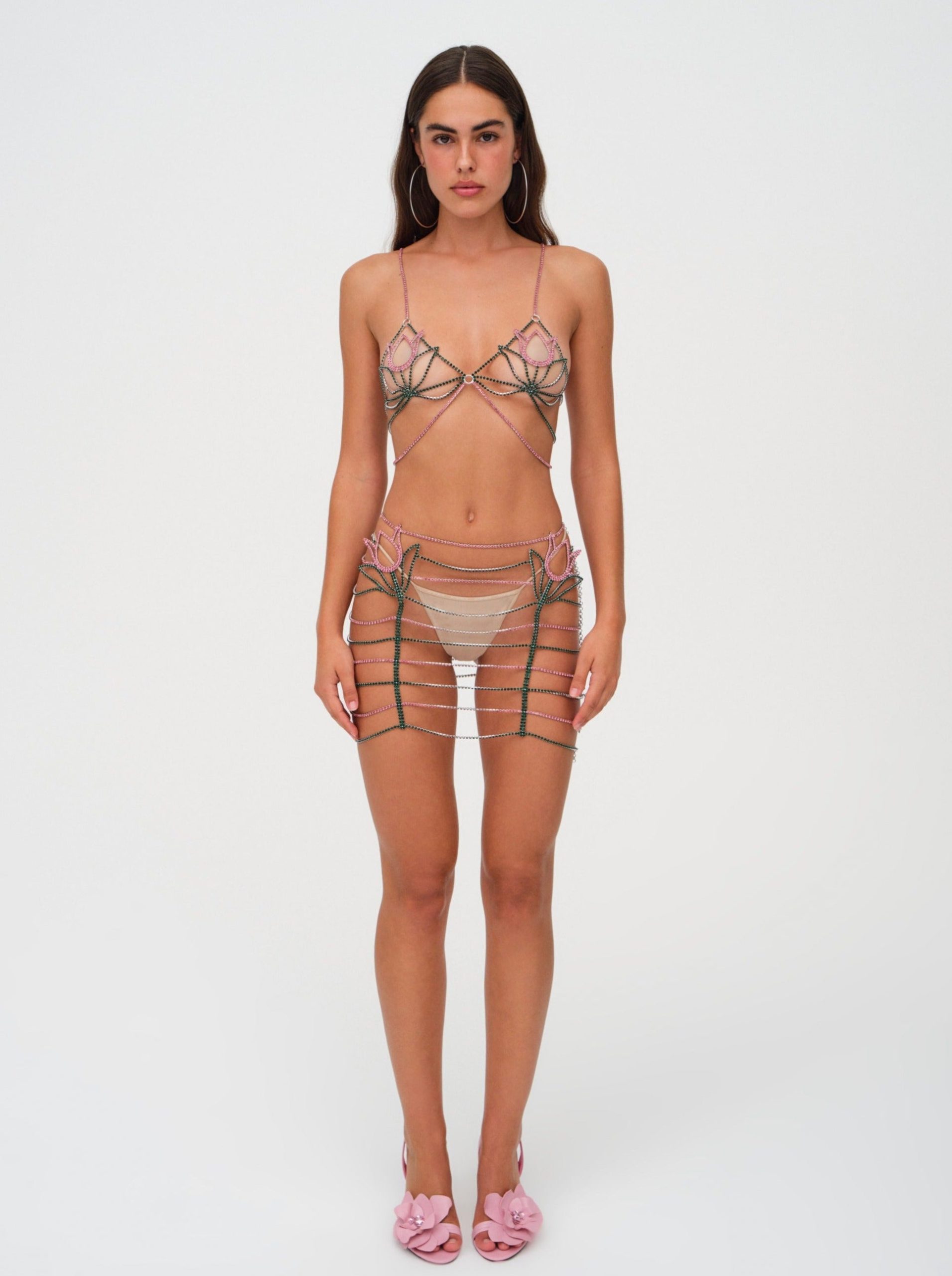 The arrival of Spring means the arrival of tulips—tulip body jewelry, that is. This green and pink rhinestone bralette flatters your curves and catches the light as you move, making it the perfect rave wear for music festivals. Style it with the matching Tulip rhinestone skirt for a matching skirt set.