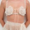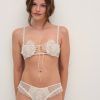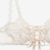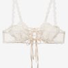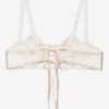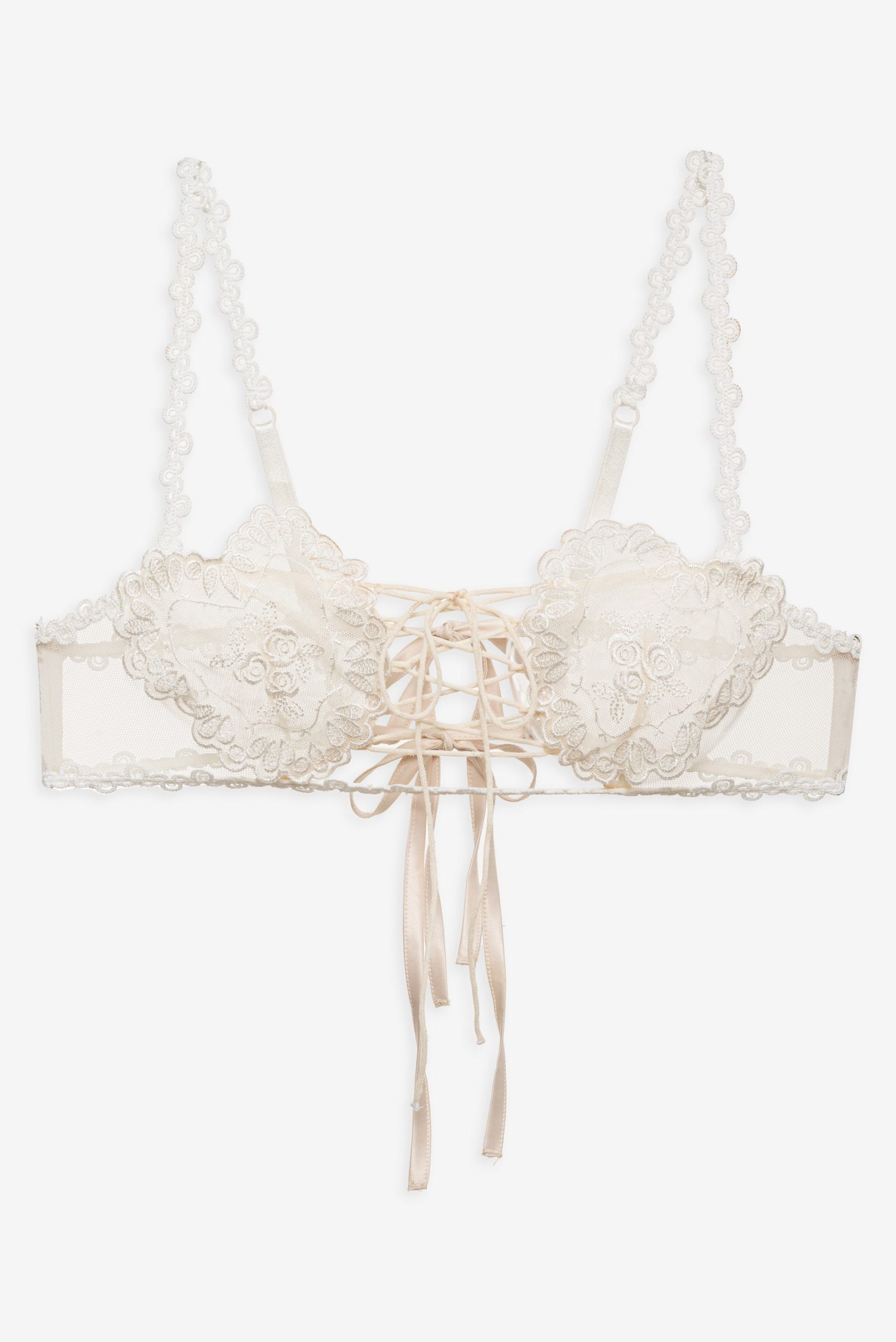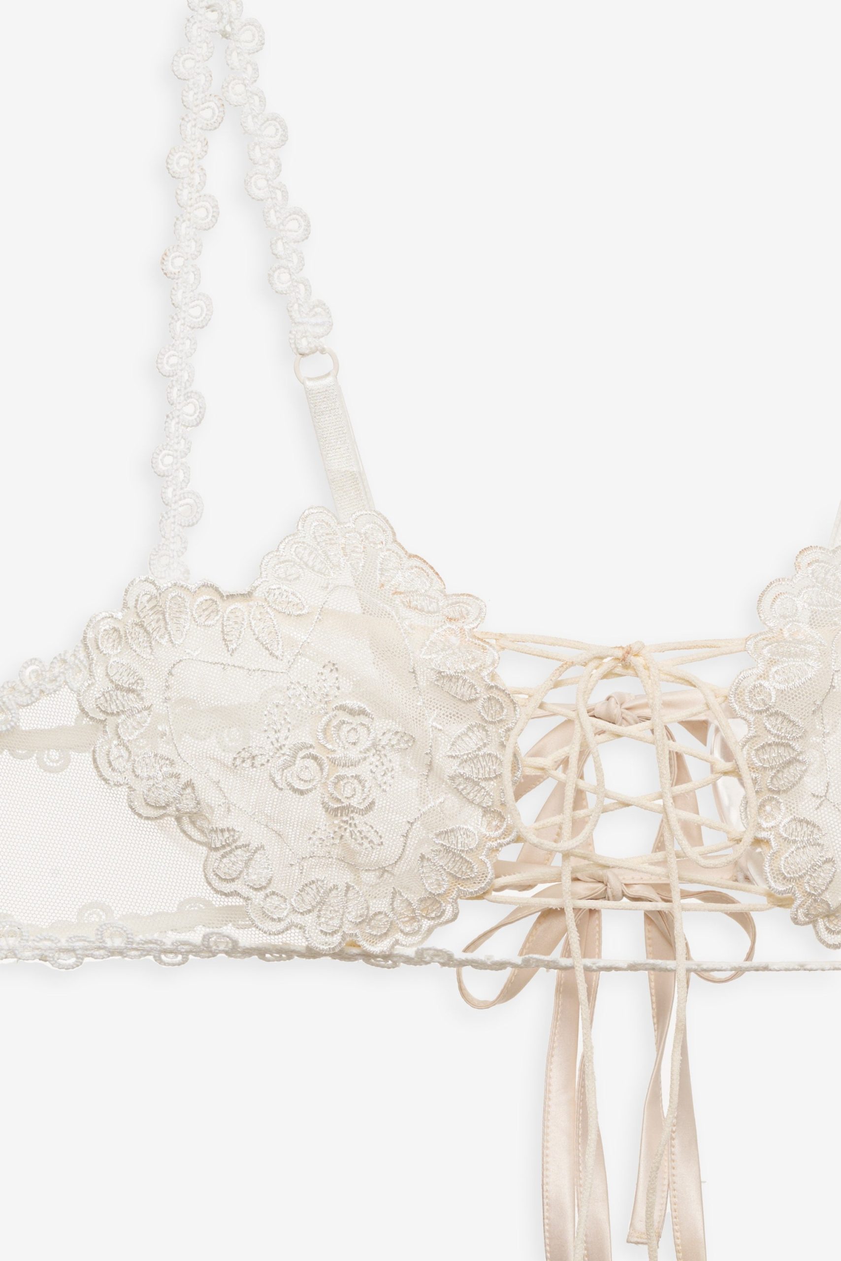 An ode to nostalgic lingerie of eras past–the Vintage Embroidery sheer bra exudes antique charm. Crafted in dainty tulle, this white bralette is adorned with heart shaped embroidered cups, decorative lace trims, functional satin lace-up ties at the center-front, and ribbon ties at the center-back.