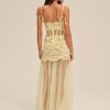 Dress for the Riviera with the Viola lace maxi gown–a butter yellow dress crafted in a classic floral lace and adorned with scallop hems at mini length. This corset dress features a boned sheer mesh bodice, functional dome buttons down center-front, and a sheer tulle maxi skirt for an effortlessly feminine chic look.
