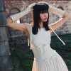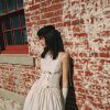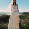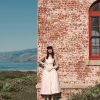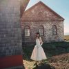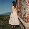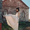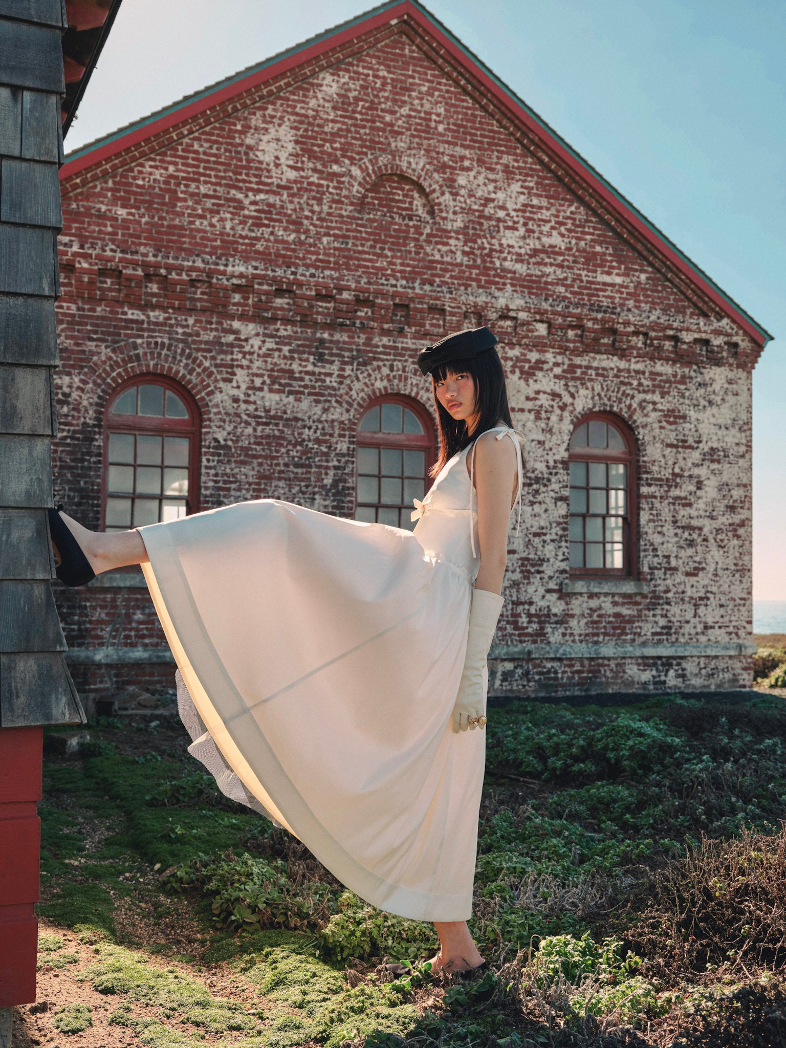 Designed for the modern romantic, the Mollie cream midi dress redefines tradition with its ultra-chic high squared neckline and drop-waist bodice. This bridal dress is adorned with bow details at the center-front and features a full gathered circle-cut skirt for an enchanting look.